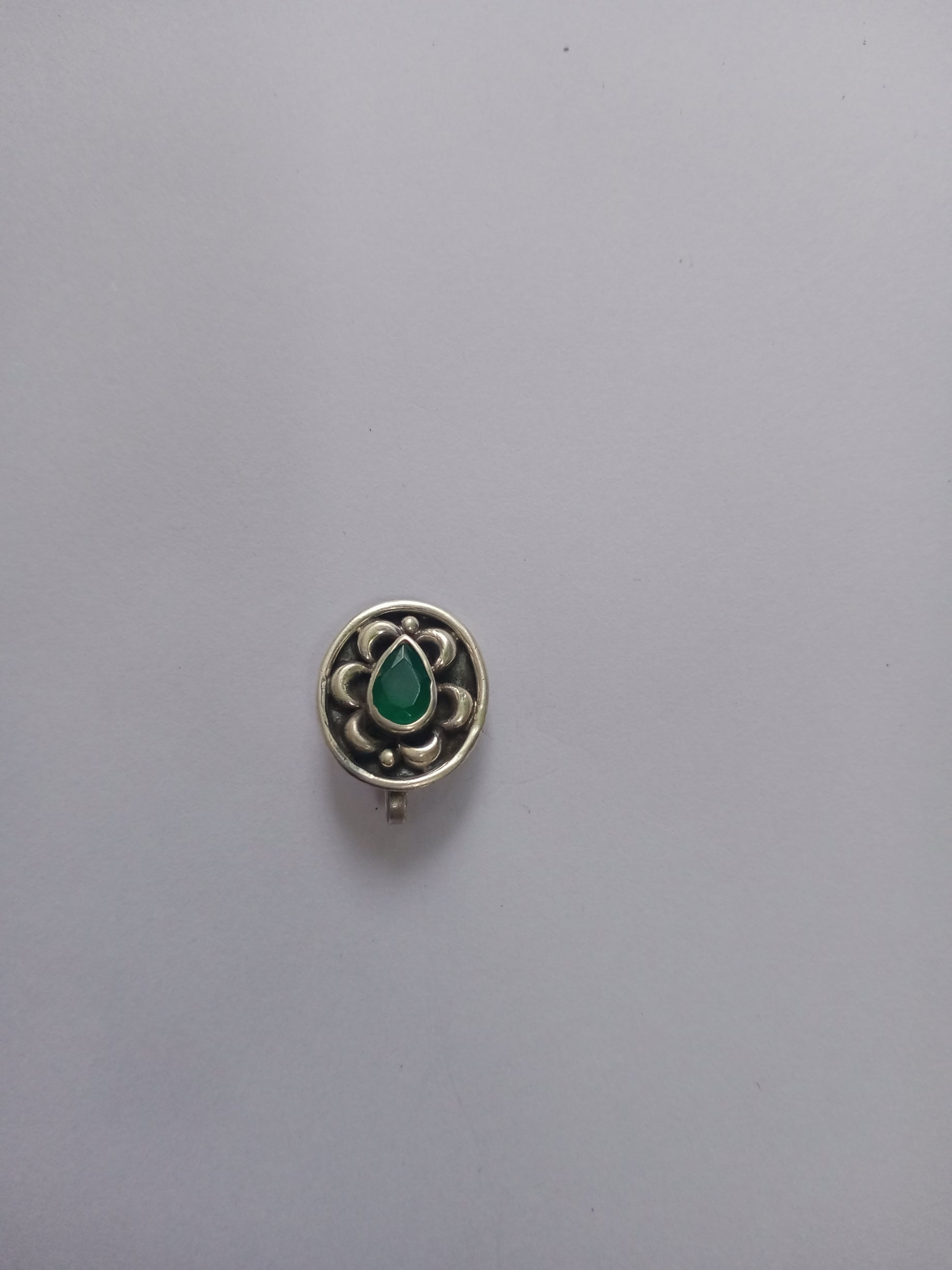 A delicate 92.5% pure silver press-on nose clip featuring a pear-shaped green gem at its center, set in a floral-beaded round motif. Elegant, piercing-free and lightweight — perfect for adding a subtle ethnic flair to your look.