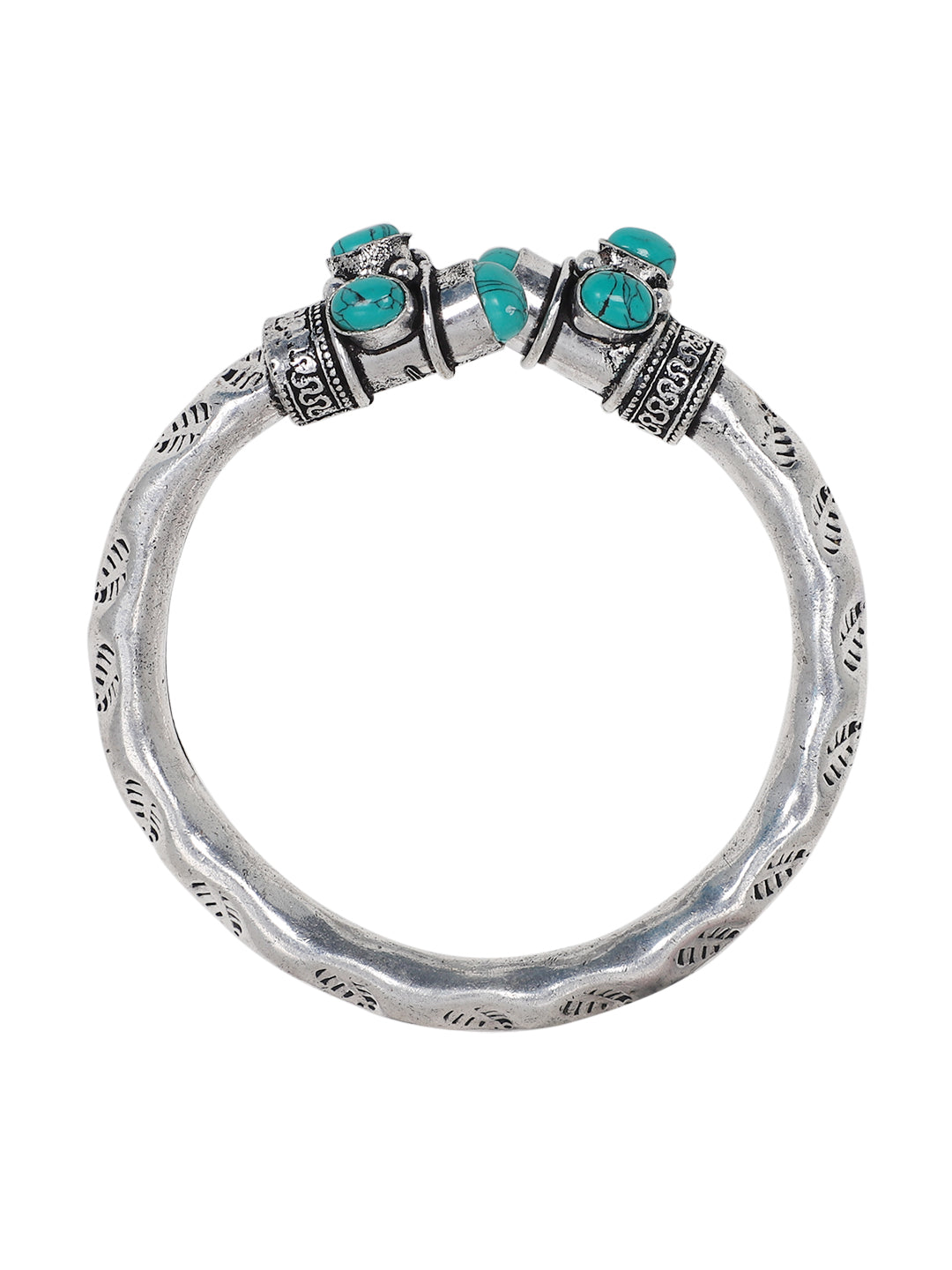 A bold and timeless piece, this oxidized silver bangle is adorned with striking turquoise stone clusters on both ends. The antique finish of the metal enhances its rustic charm, while the intricate detailing along the band adds a touch of artistry. Perfect for those who love statement jewelry, this handcrafted bangle blends ethnic elegance with a vintage appeal, making it a versatile accessory for both traditional and contemporary outfits.