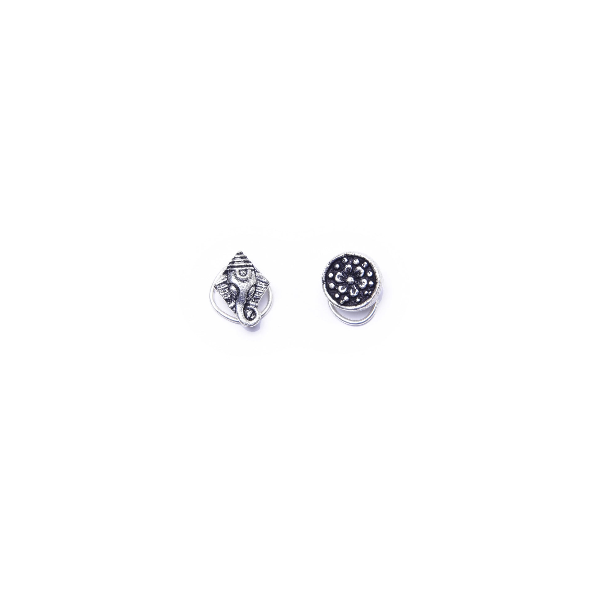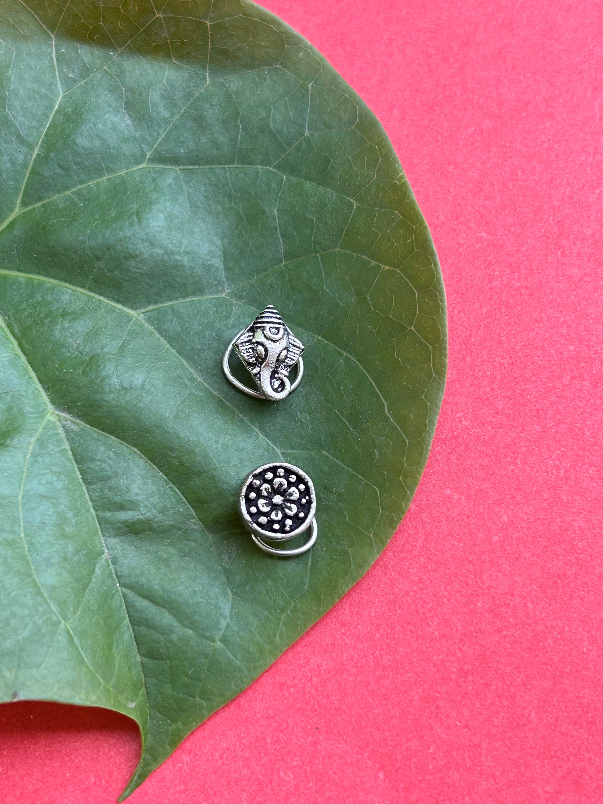 This unique set of oxidized nosepins blends spirituality with timeless elegance. One nosepin features an intricately crafted Lord Ganesha motif, symbolizing blessings and positivity, while the other displays a traditional floral design, adding a touch of grace and charm.