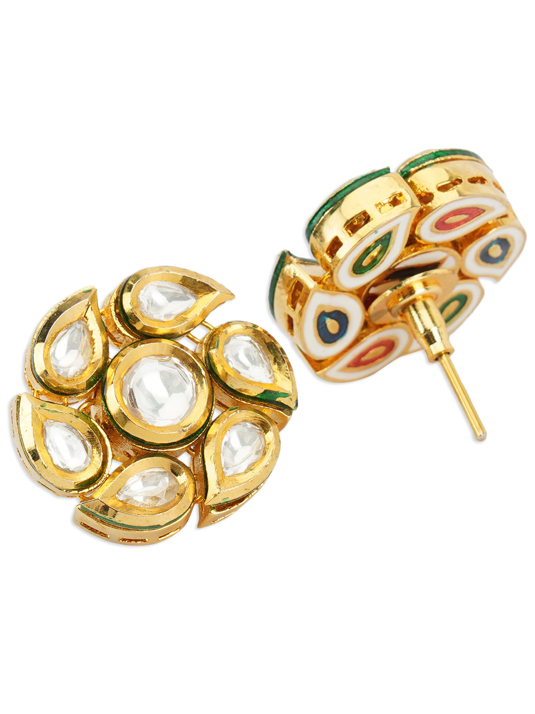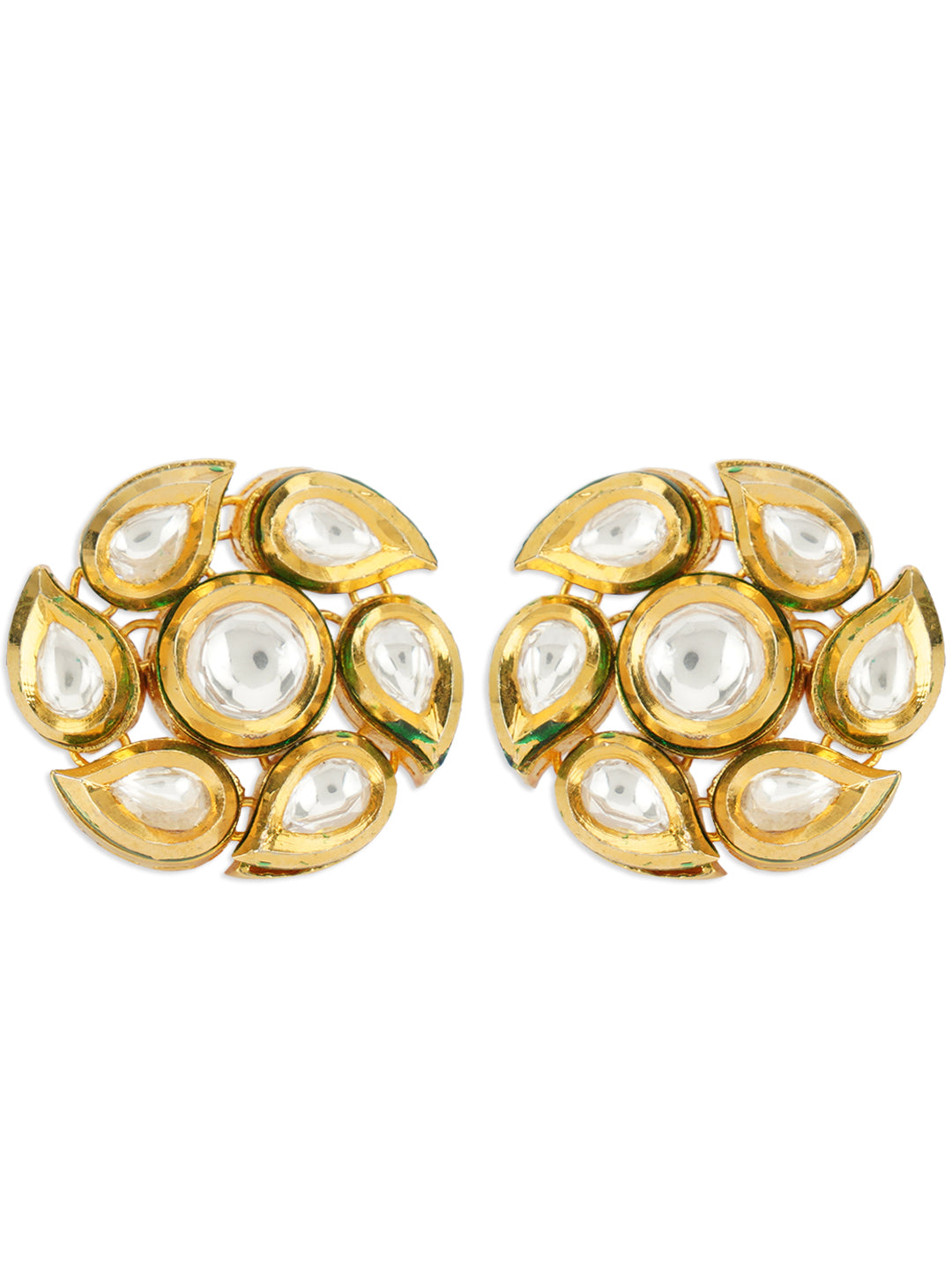 A radiant bloom of tradition and fire, this handcrafted necklace entwines vivid red beads—evoking sindoor, shakti, and sacred flame—with strands of warmth and grace. Each gold-plated medallion is adorned with Kundan-set white stones, blossoming like celestial lotuses in full light. The floral motifs shimmer with quiet opulence, while the adjustable bead-and-chain closure offers a gentle, customizable fit.