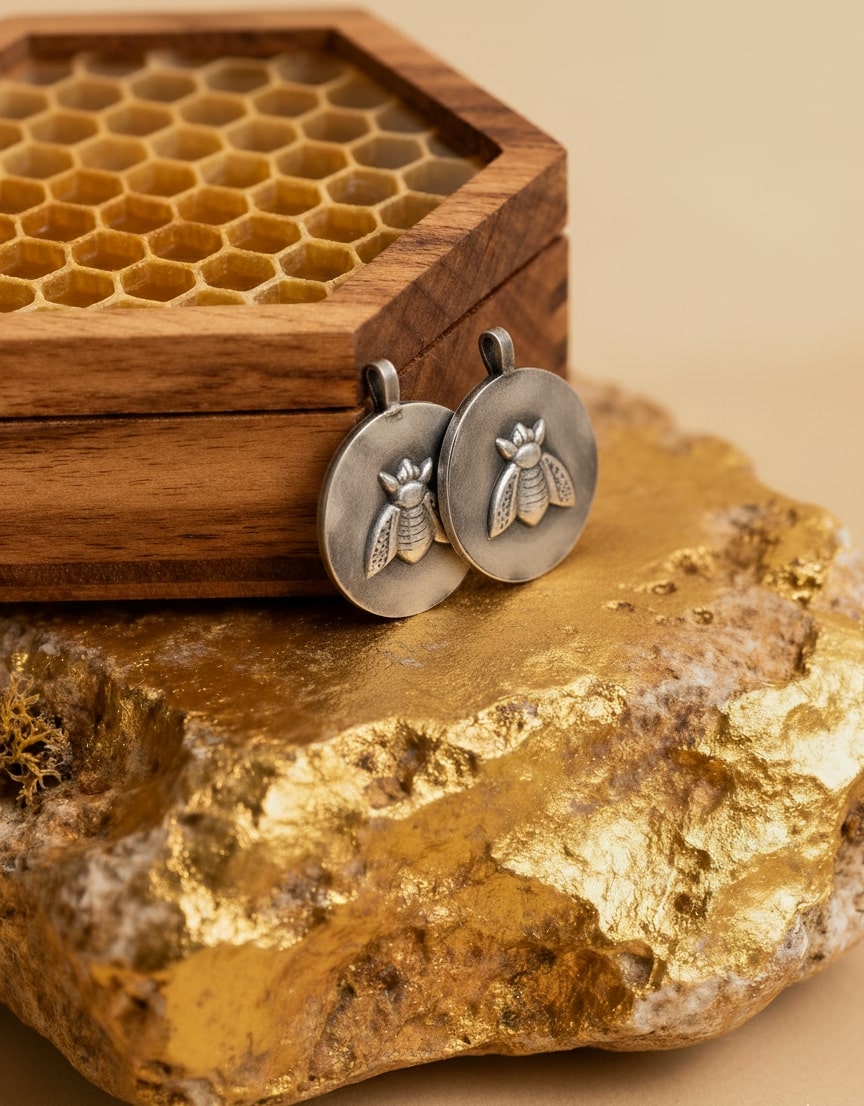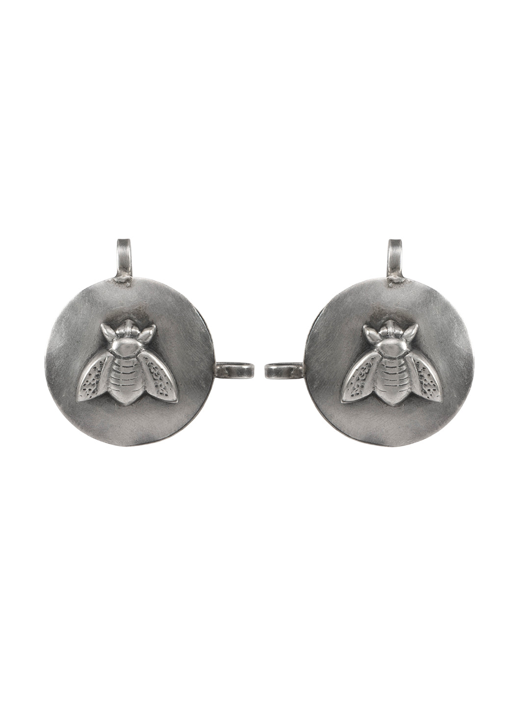 A tribute to nature’s alchemy, these silver Bugadi earrings feature a raised bee motif—symbol of diligence, sweetness, and cosmic order. Nestled in oval frames, they echo the hum of creation.Wear them to invoke purpose, grace, and a touch of wild gold.
