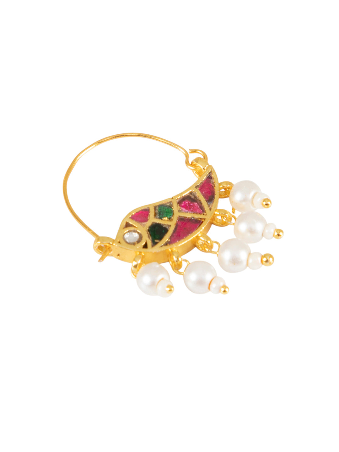 Grace your ethnic ensemble with timeless elegance by adorning this exquisite gold-plated nath. Designed with rich kundan-inspired stonework in jewel tones and finished with delicate pearl clusters, this traditional nose ring reflects classic Indian craftsmanship.Lightweight yet striking, this nath is perfect for weddings, festive celebrations, and cultural occasions. Its elegant hoop design ensures a comfortable fit while adding a royal touch to your bridal or festive look.