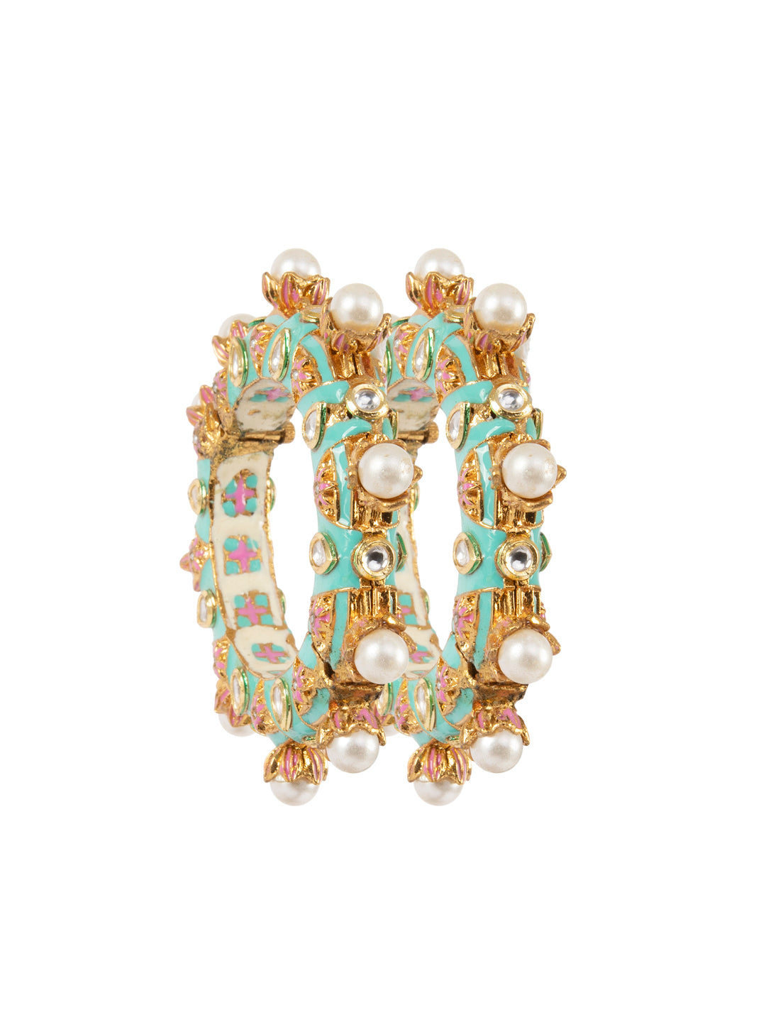 A celebration of color, craft, and cultural memory, Rangrez-e-Bahar bangles are hand-painted with turquoise skies and blush-pink blossoms—each stroke a whisper of springtime poetry. Faux pearls sway like dew-kissed buds, while the inner enamel reveals a secret garden of geometric florals. With gold-toned accents and Mughal-inspired motifs, these bangles are not just ornaments—they are wearable canvases of joy, nostalgia, and feminine grace.