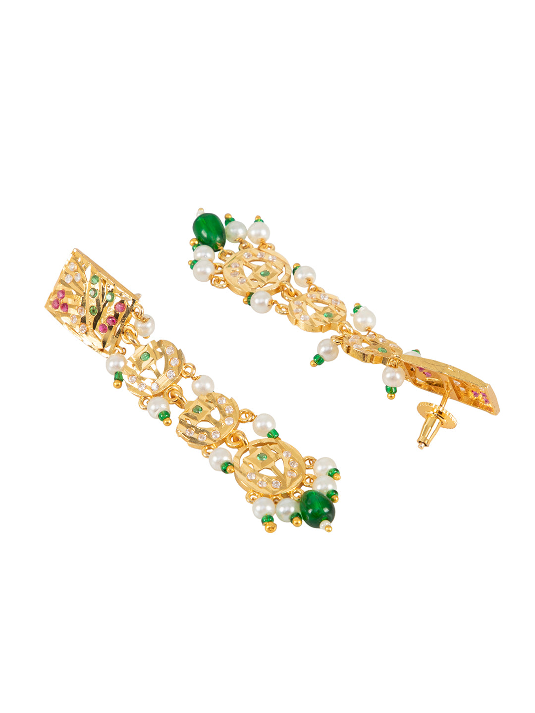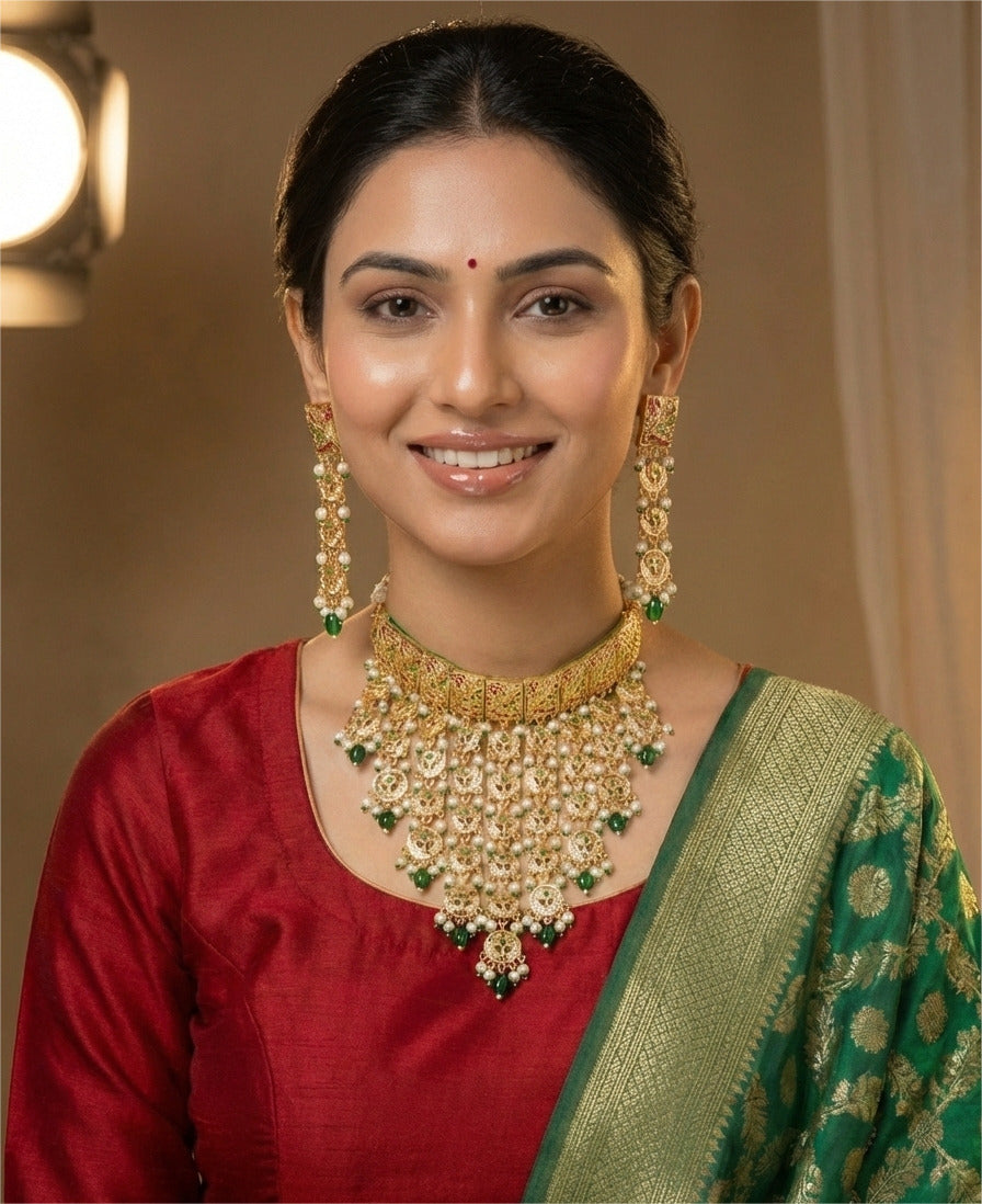 | Inspired by royal heirlooms, the Viraasat Kundan Pearl Necklace Set showcases a richly crafted choker-style necklace with layered pearl hangings and finely set kundan-polki work. Paired with long, matching earrings, this set brings unmatched grace and sophistication to bridal and traditional attire. |