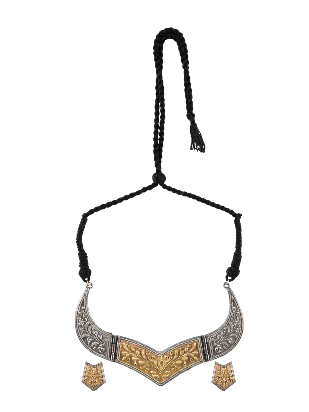 Make a bold ethnic statement with this stunning dual-tone necklace set, inspired by regal tribal artistry. Crafted in an elegant blend of oxidised silver and antique gold finish, the necklace showcases intricate hand-etched floral and vine motifs arranged in a striking crescent silhouette. The structured design sits gracefully on the collarbone, adding a powerful yet refined touch to your look.The set is paired with matching geometric stud earrings featuring detailed gold-toned engravings, perfectly complementing the necklace’s ornate craftsmanship. Ideal for festive occasions, weddings, and cultural celebrations, this necklace set pairs beautifully with sarees, lehengas, and fusion outfit