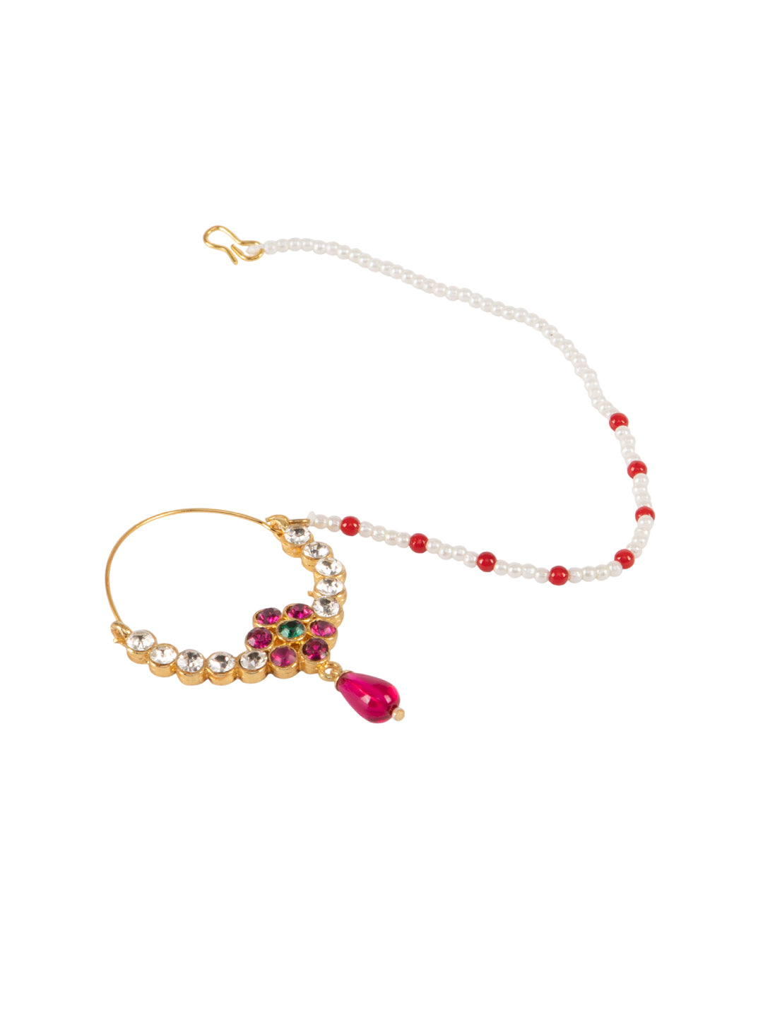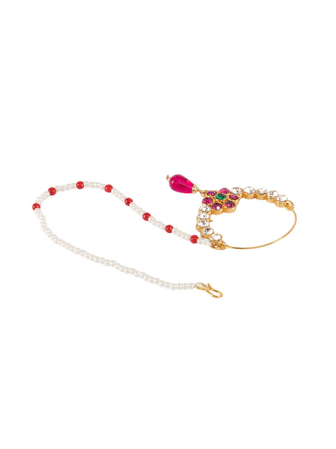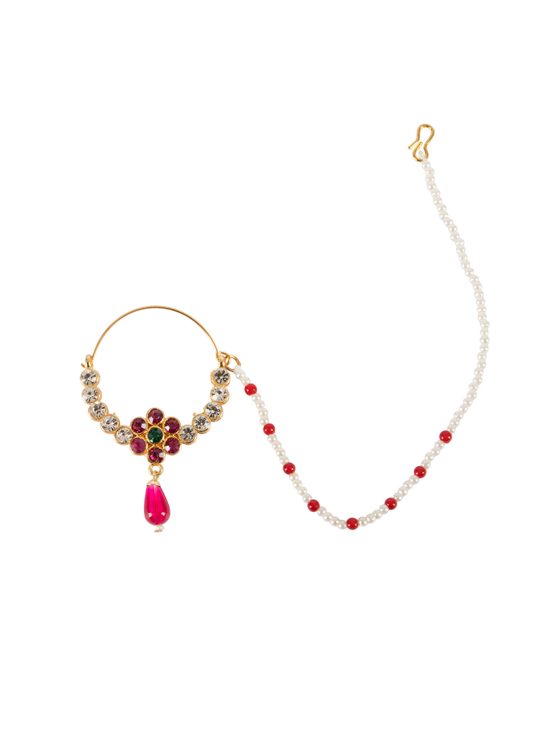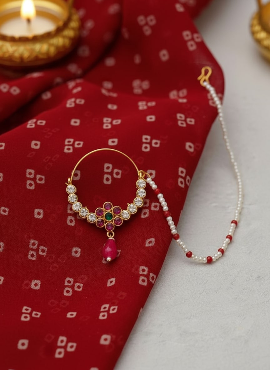 Yamini is a nath born of twilight dreams—where emerald hearts pulse within pink petals, and every curve whispers a verse of devotion. The floral centerpiece glows like a moonlit bloom, while the teardrop bead sways like a secret waiting to be spoken. Strung with alternating pearls and crimson beads, the chain trails like a prayer across the cheek. This is not just jewelry—it’s a nocturne of beauty, crafted for ceremonies, stories, and the woman who wears her heritage like poetry.