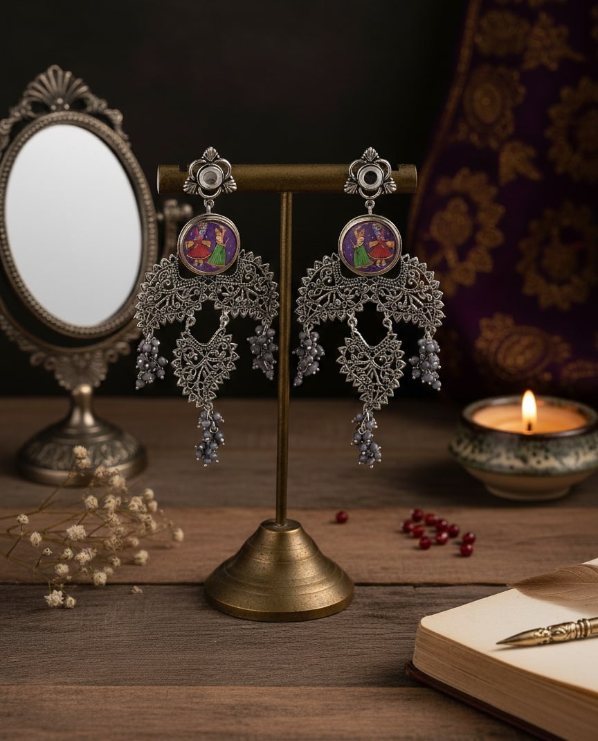 Handcrafted with reverence, these silver-toned coin earrings feature a vivid hand-painted tableau of Radha and Krishna dancing in divine harmony. Framed in ornate filigree and adorned with crimson bead clusters, they echo the rhythm of devotion, love, and cosmic play. A wearable celebration of leela and legacy
