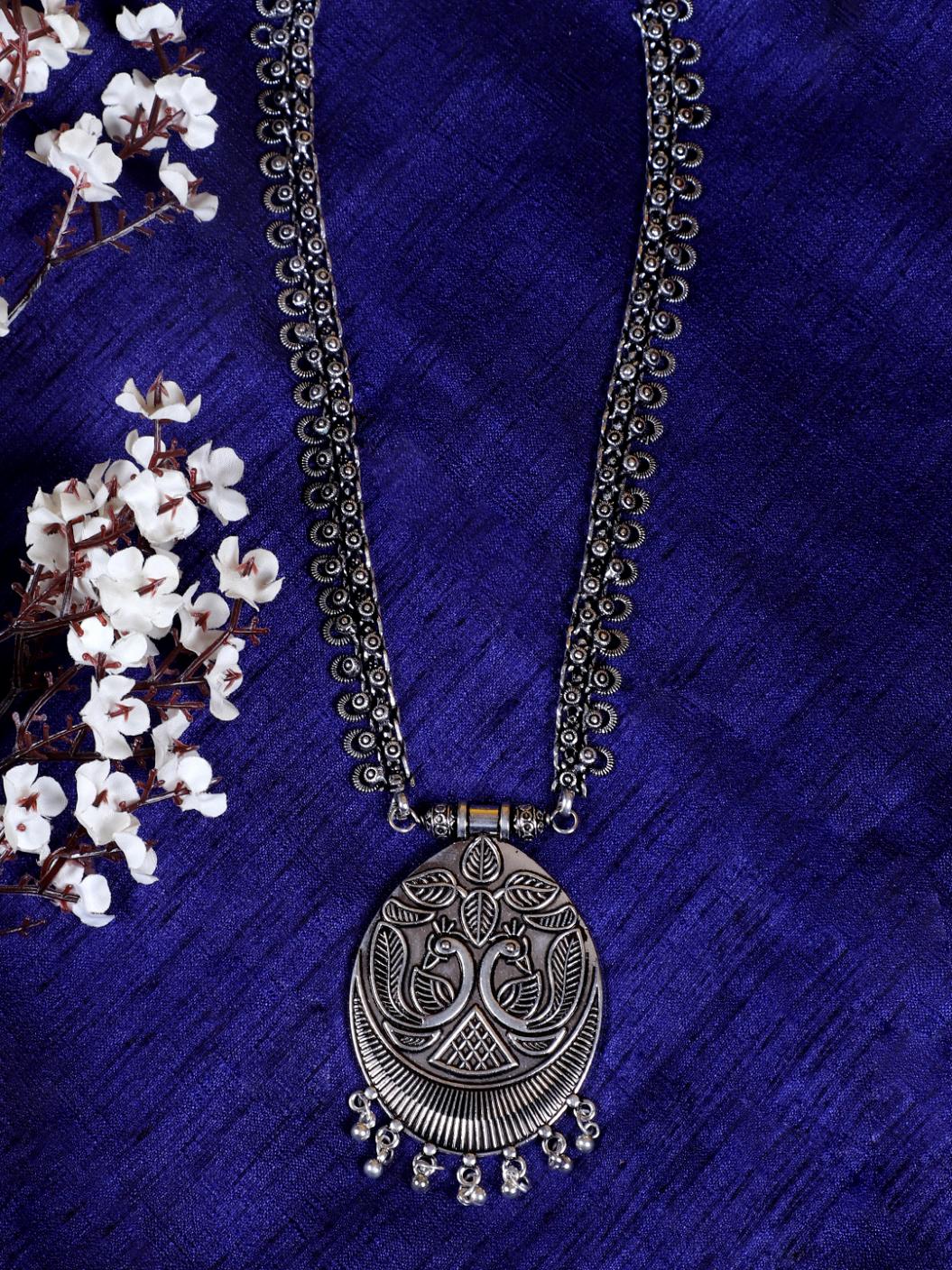 | This elegant silver necklace features a large oval pendant adorned with an intricate engraving of a pair of peacocks, symbolizing beauty and grace. The pendant is complemented by delicately decorated side strings, featuring ornate silverwork and subtle detailing that enhance its timeless charm. Accentuated with dangling elements, it makes for a perfect statement piece for any occasion. |