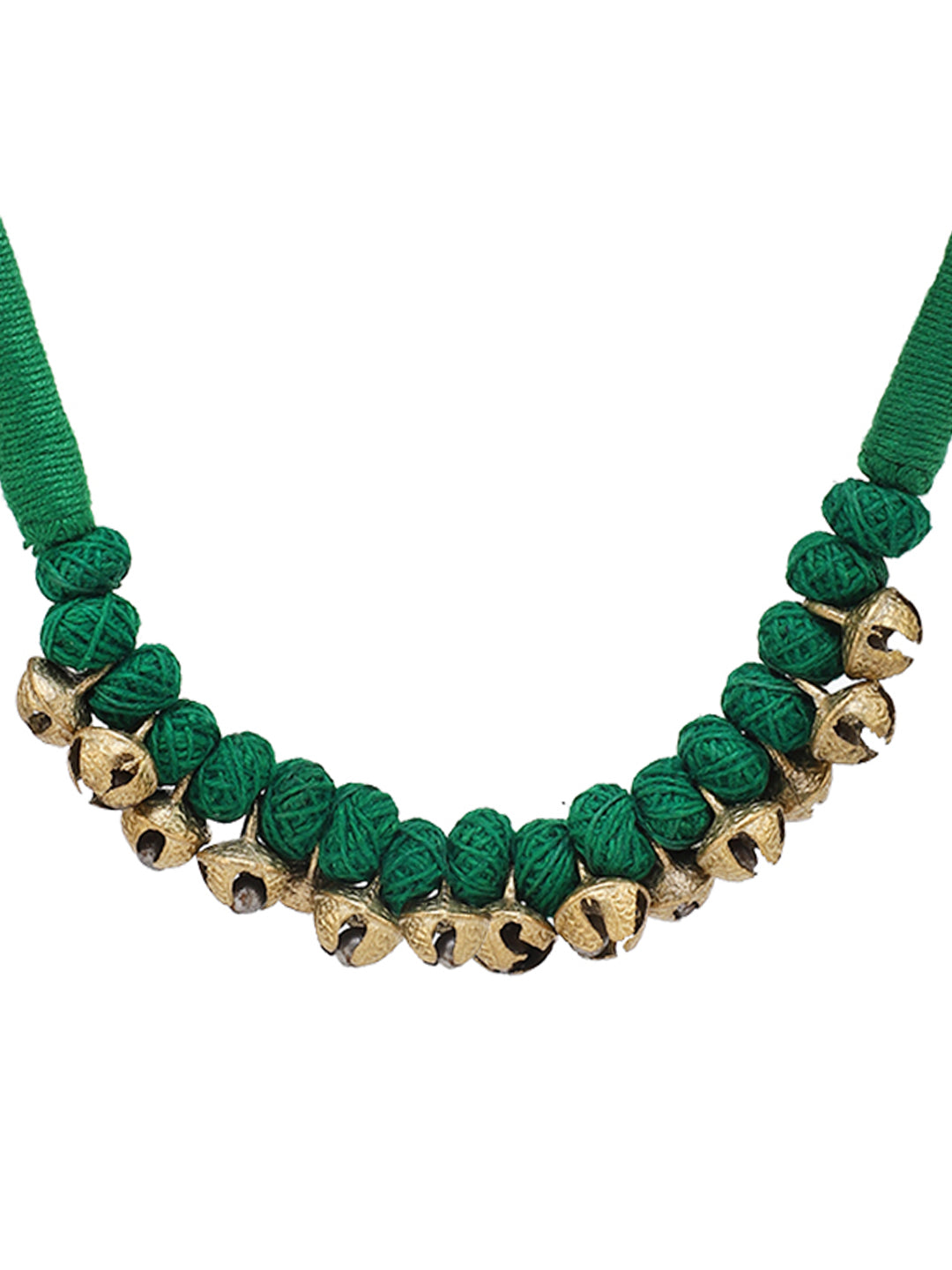 | This handcrafted necklace blends tradition with rhythm, featuring a rich green thread adorned with alternating golden and thread-wrapped beads. Delicate ghoongru accents infuse it with a melodic spirit, evoking echoes of classical dance and cultural elegance. Lightweight yet expressive, it’s a graceful accessory that celebrates heritage in every jingle. |