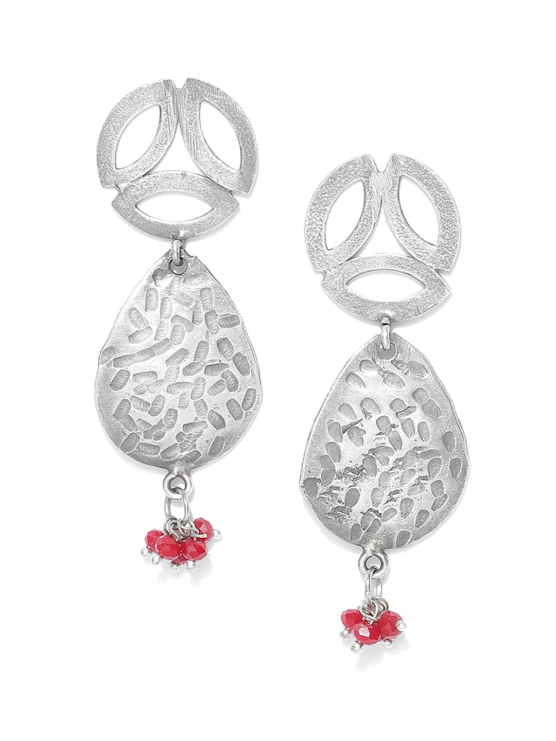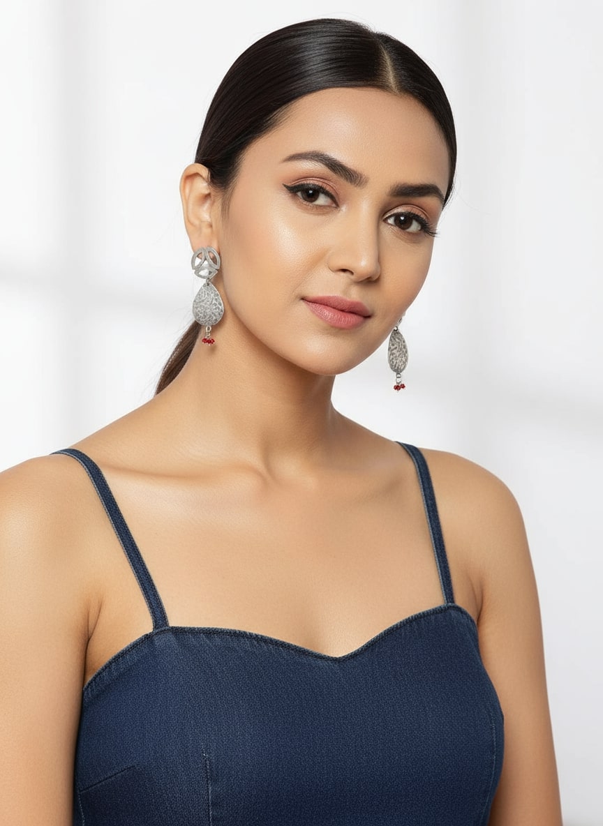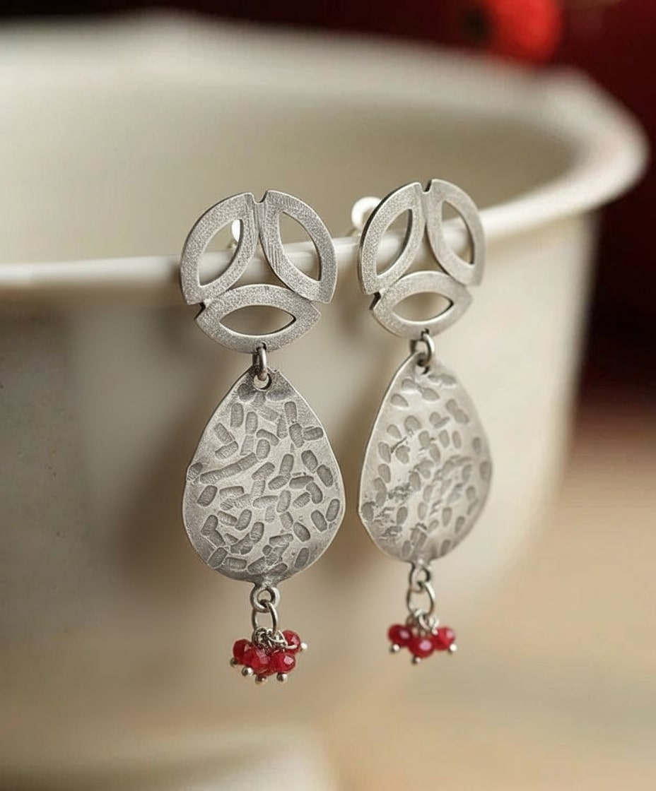 Rooted in organic elegance, these earrings pair a textured silver teardrop with a golden-hued circular base etched in leaf-like silhouettes. The crimson bead accent adds a quiet spark, evoking autumn berries against forest metal. A tribute to nature’s poetry, they’re crafted for those who wear symbolism with grace.