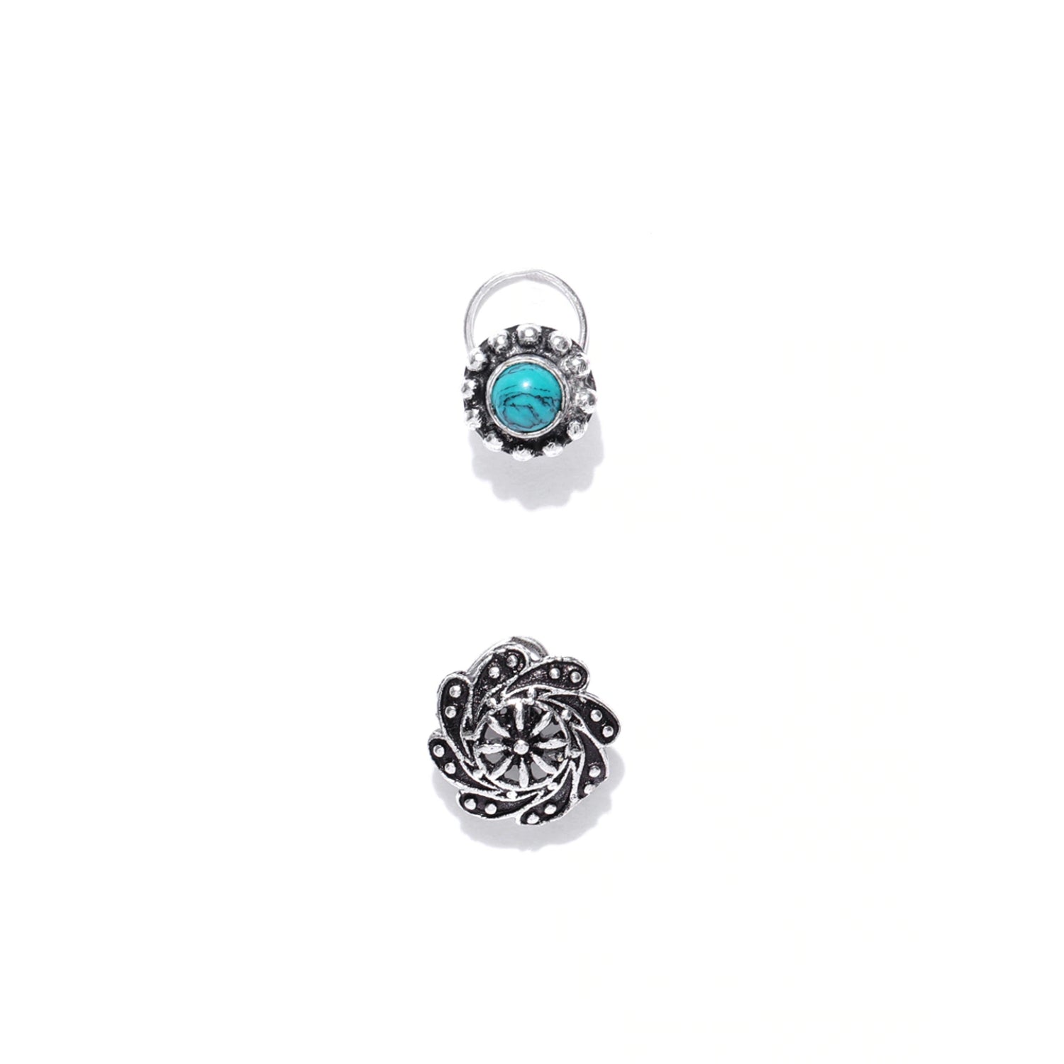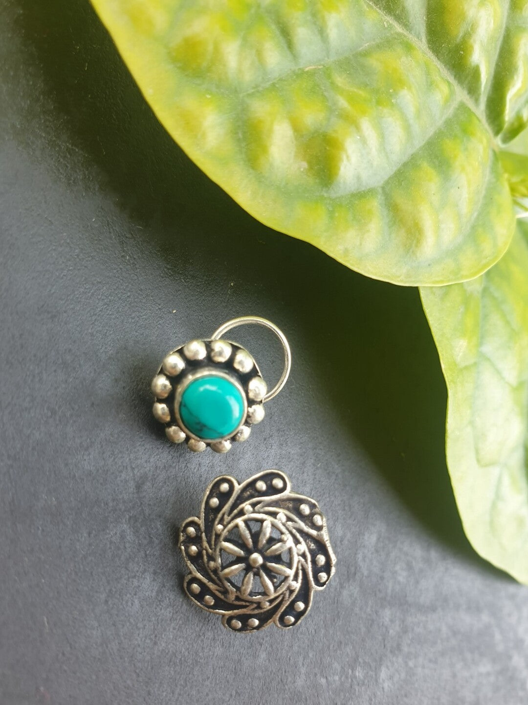 A tale of two energies—Jal, the turquoise-stone earring, flows with serenity and emotional depth, while Vayu, the swirling metallic piece, dances with movement and ethereal grace. Together, they embody elemental duality: water and wind, stillness and motion. Handcrafted to evoke cosmic balance, this pair invites you to wear your inner rhythm.