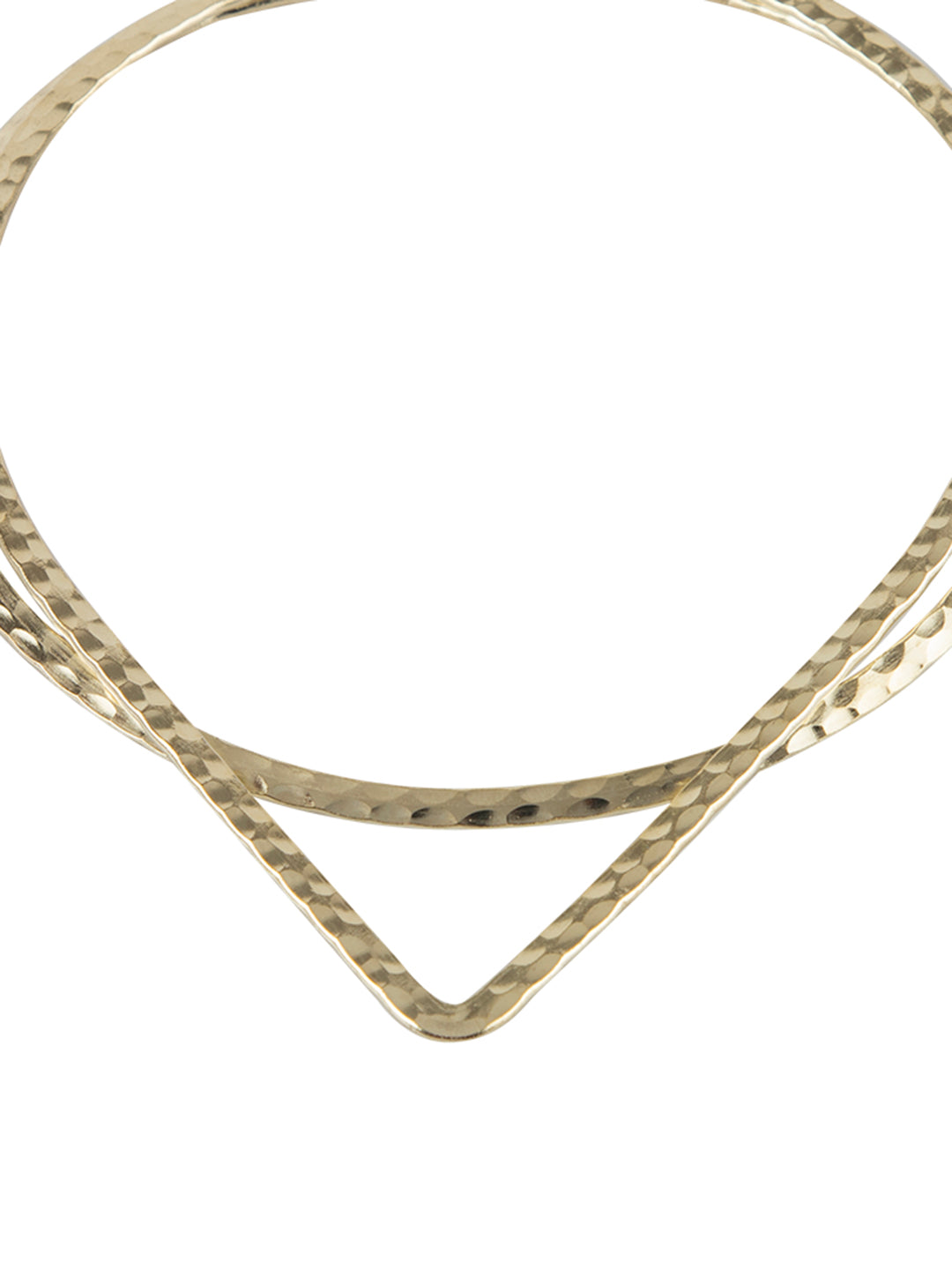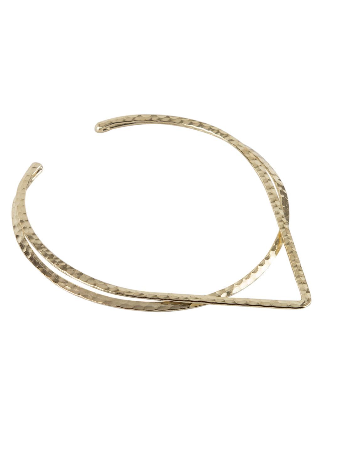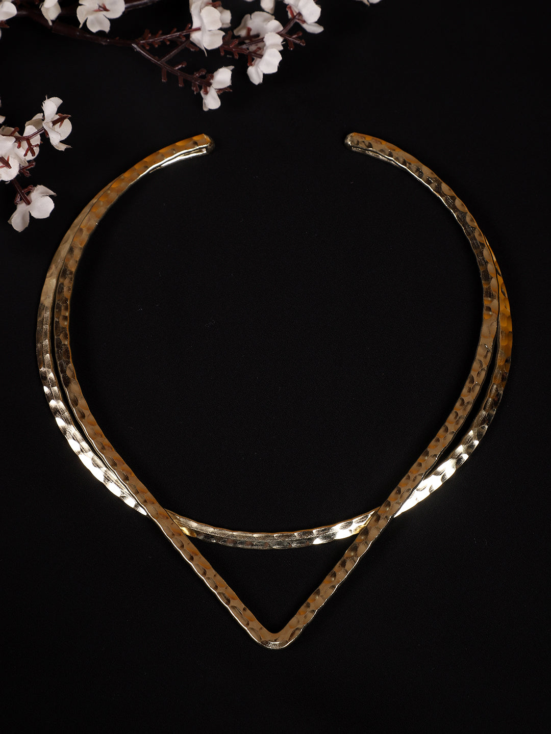| This distinctive hasli necklace boasts a bold tribal-inspired design, with its golden curved structure exuding elegance and heritage. Carefully handcrafted, it is a statement piece perfect for pairing with both traditional and contemporary outfits, celebrating artisanal craftsmanship and cultural roots. |