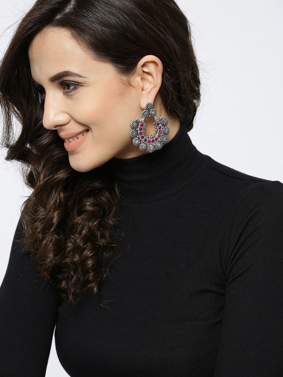A celebration of celestial grace and earthy allure, these crescent-shaped earrings bloom with red and white stones set in floral harmony. The outer rim sparkles with delicate white blossoms, while the inner arc glows with deep crimson—evoking twilight skies and festive warmth. Handcrafted to enchant, they pair tradition with timeless elegance.