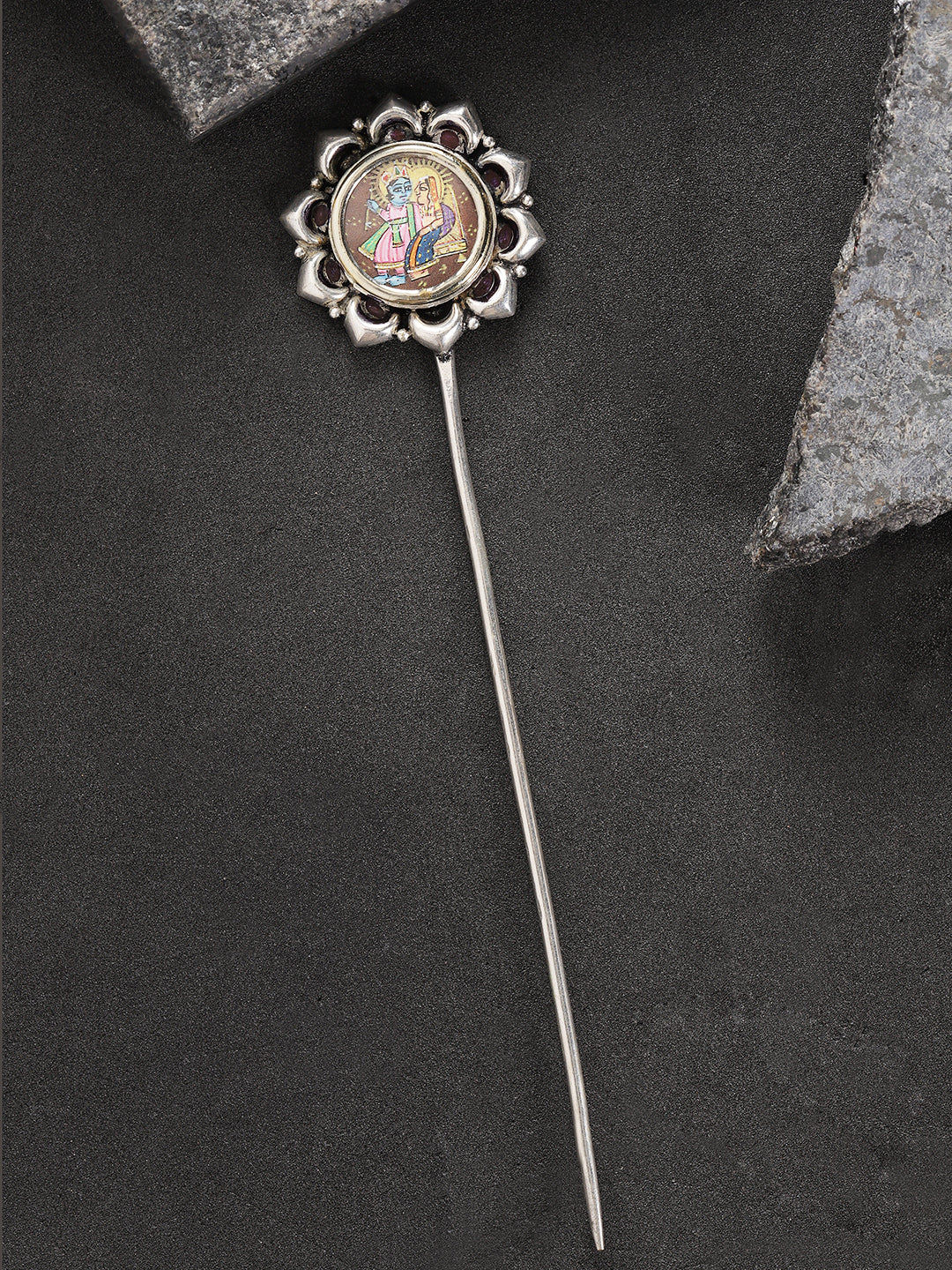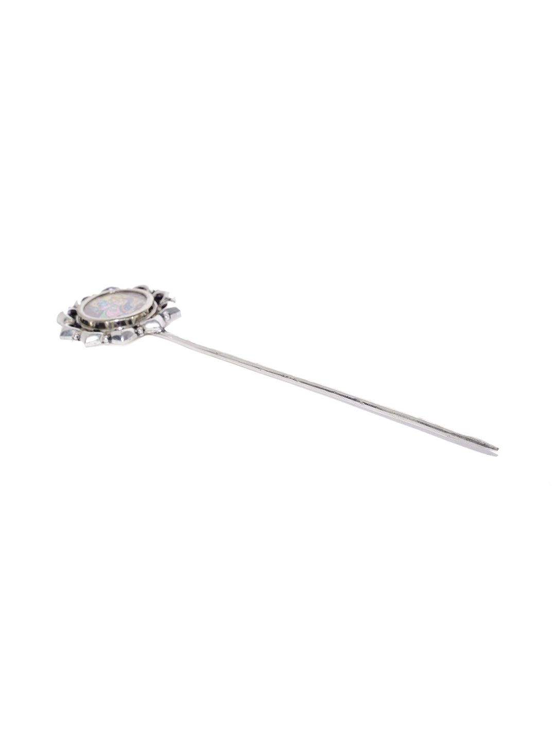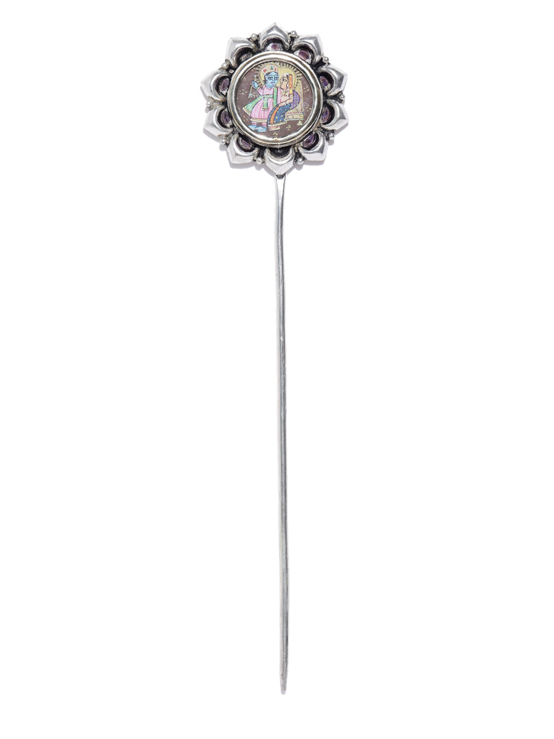 Gracefully sculpted and rich in detail, this ornamental hair stick features a Radha Krishna medallion that evokes vintage charm and celestial elegance. Ideal for securing buns or chignons, it adds a poetic accent to your hairstyle—where tradition meets timeless beauty.
