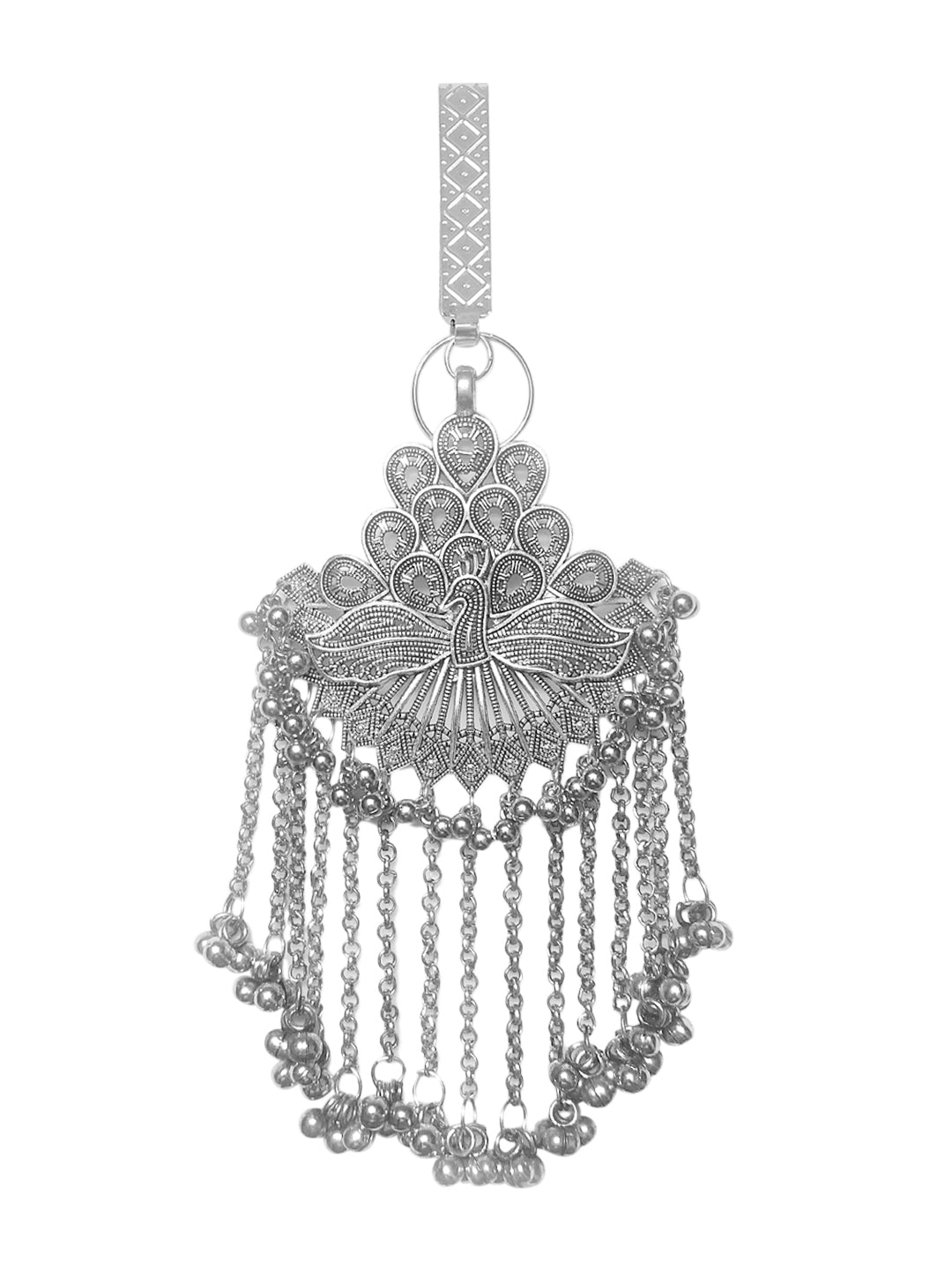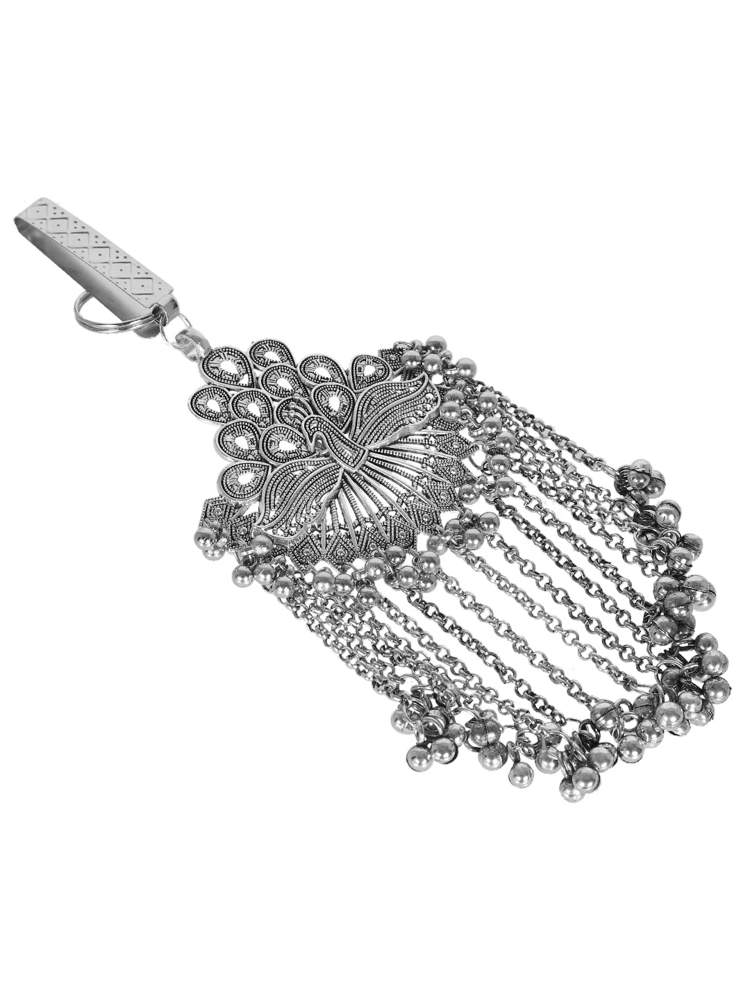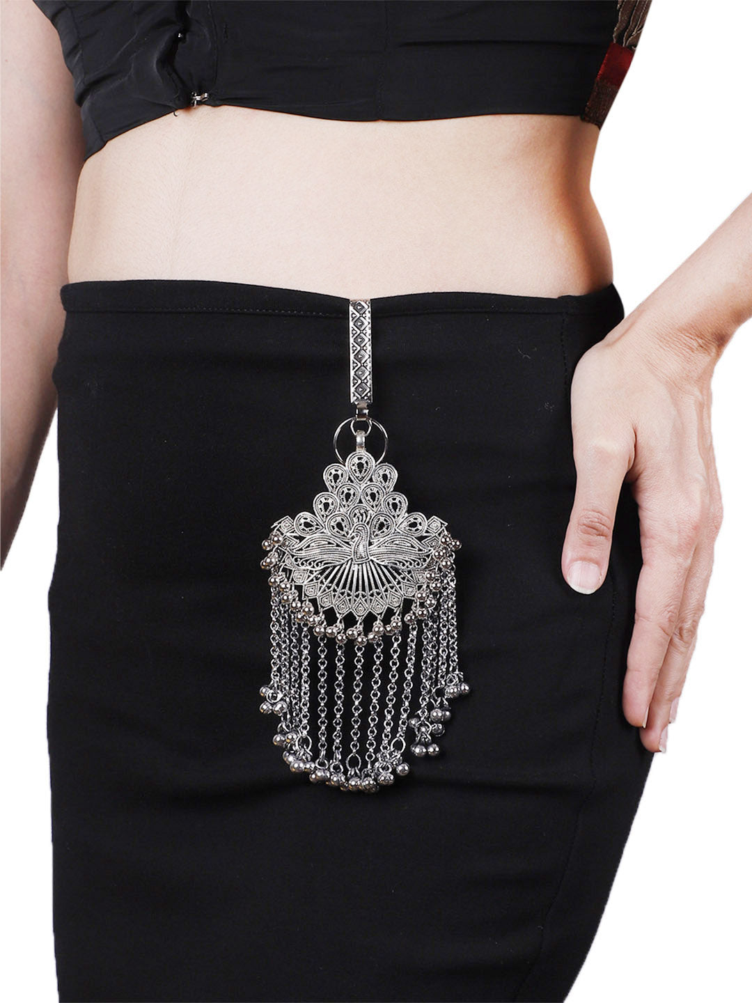 This Firoza More Oxidized Saree Gutch is the perfect accessory to add an elegant touch to your look. This silver toned saree gutcha from Firoza features a stylish oxidized finish and will take any saree outfit to the next level. Shop now for this fashionable women's fashion accessory!