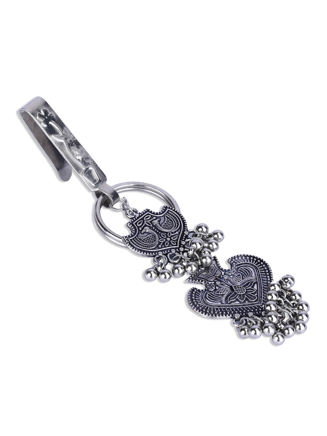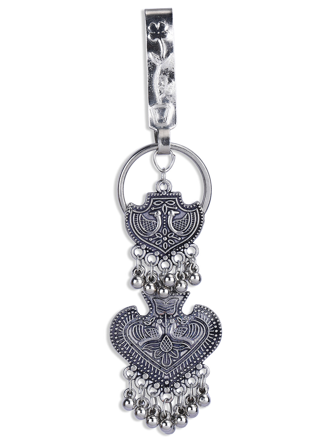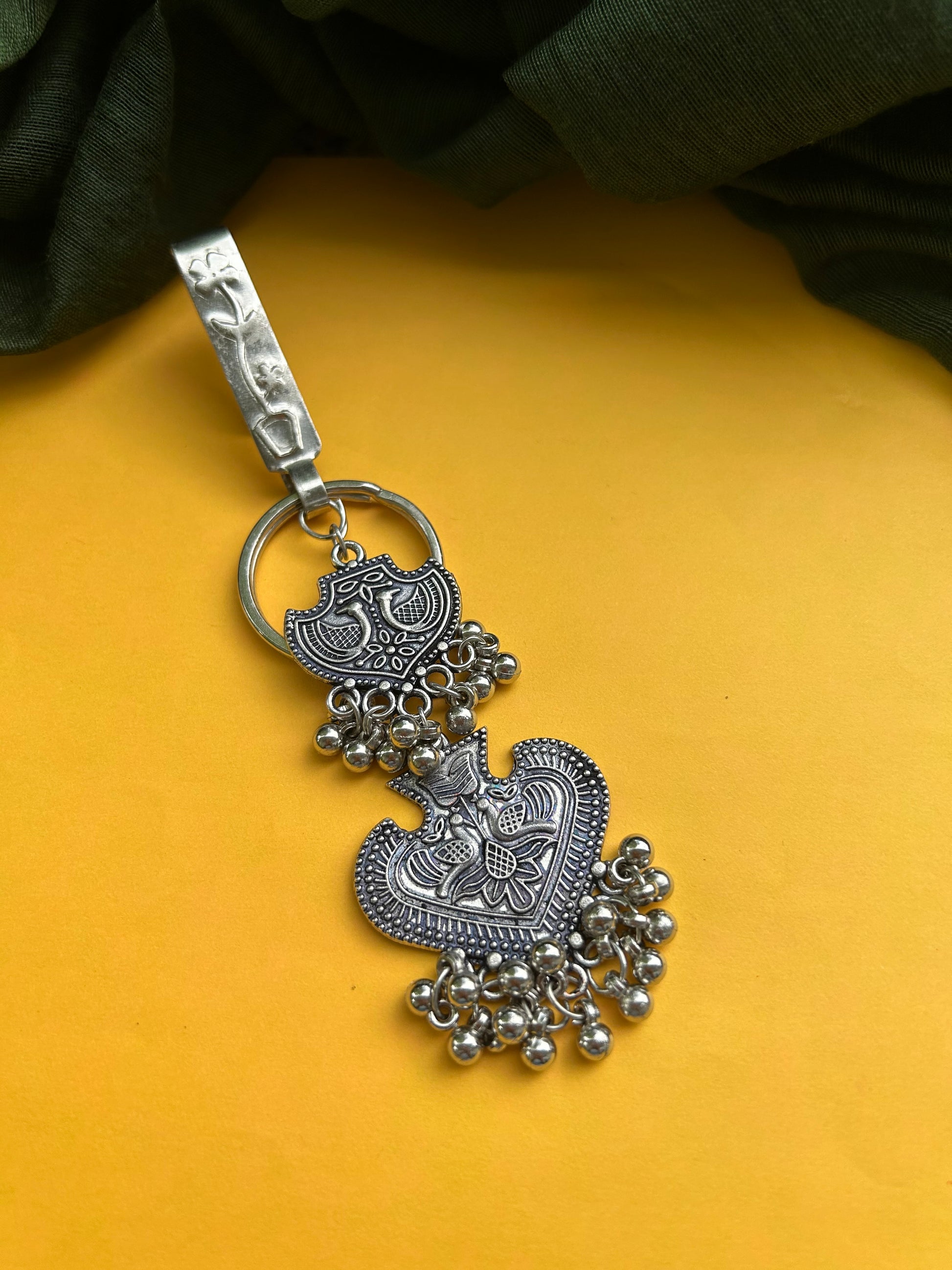 A timeless blend of tradition and artistry, this handcrafted saree gutcha features intricate floral and symmetrical engravings. The heart-shaped upper pendant flows into a circular motif adorned with delicate dangling beads, evoking echoes of temple bells and heirloom jewelry. A perfect accessory to carry a piece of culture wherever you go.