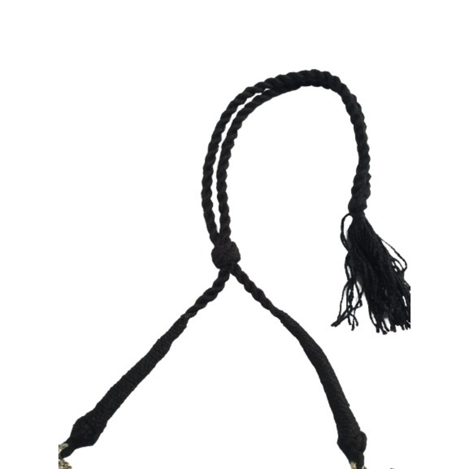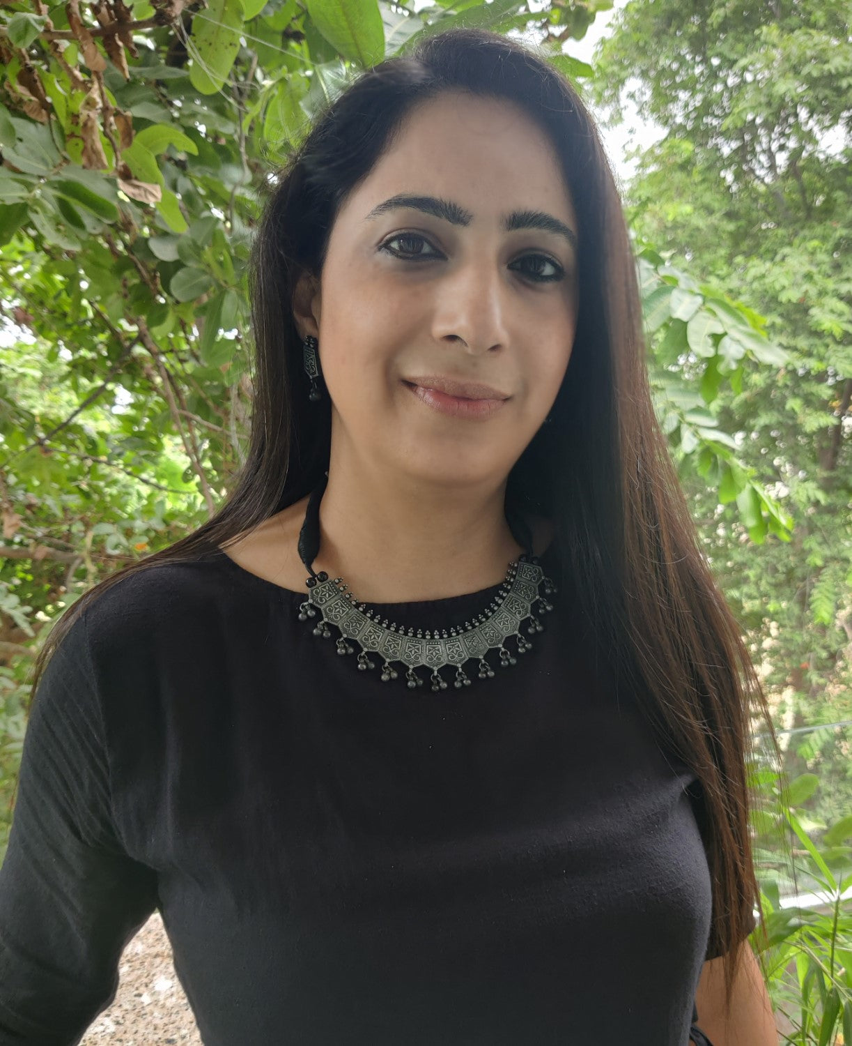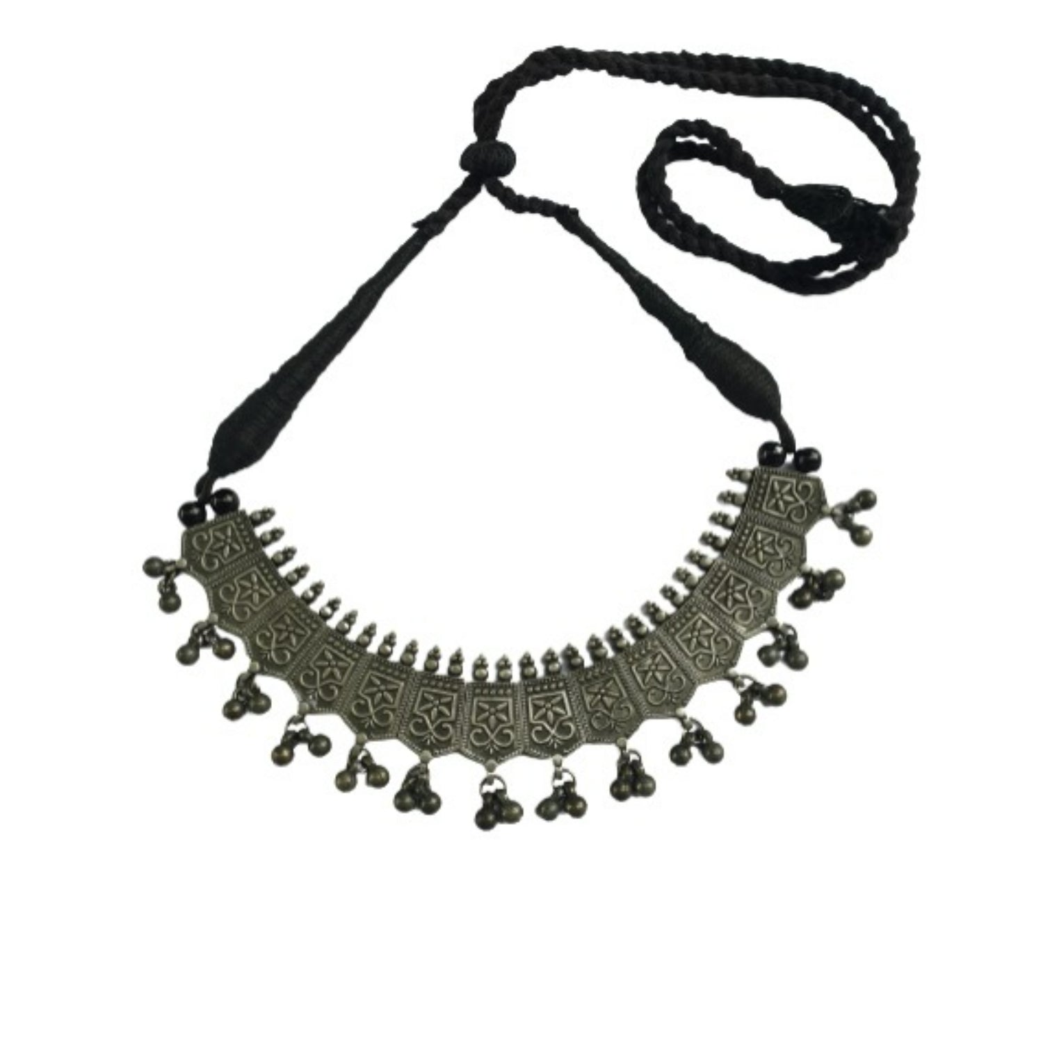 A soulful blend of heritage and edge—this oxidised silver-toned jewelry set features a handcrafted necklace and matching earrings, woven with black thread and adorned with intricate blue metallic motifs. The antique finish evokes timeless charm, while the delicate hangings add movement and mystique. Perfect for festive rituals or everyday reverence, it’s a piece that speaks in whispers of tradition and bold self-expression.