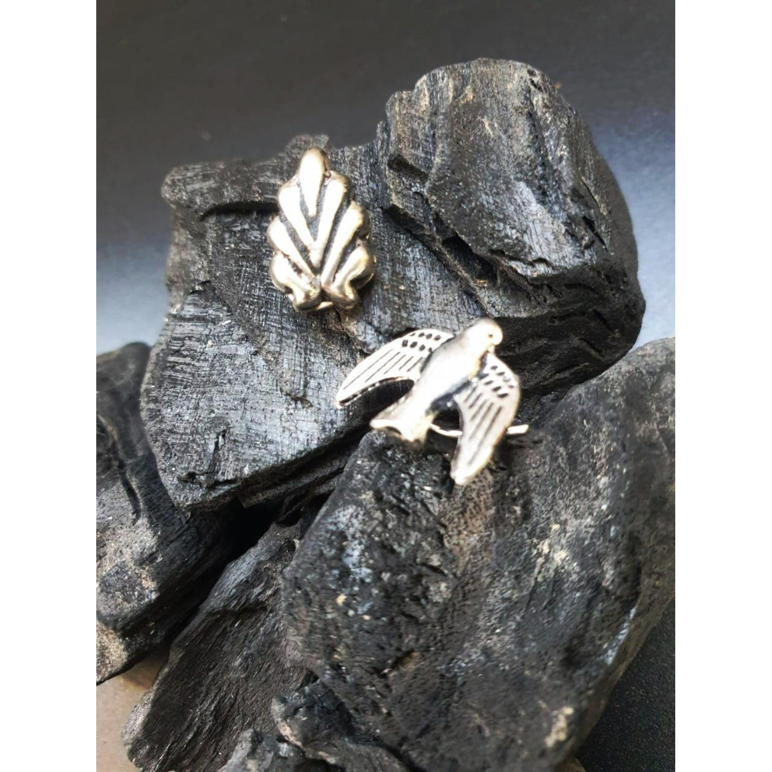 Edgy and evocative, these oxidised nosepins feature sculptural motifs—a feather and a skeletal claw—that channel elemental symbolism and rebellious grace. Set against raw textures, they offer a bold accent for those who wear their stories in metal and myth. Ideal for curated looks that blend ritual with rock.