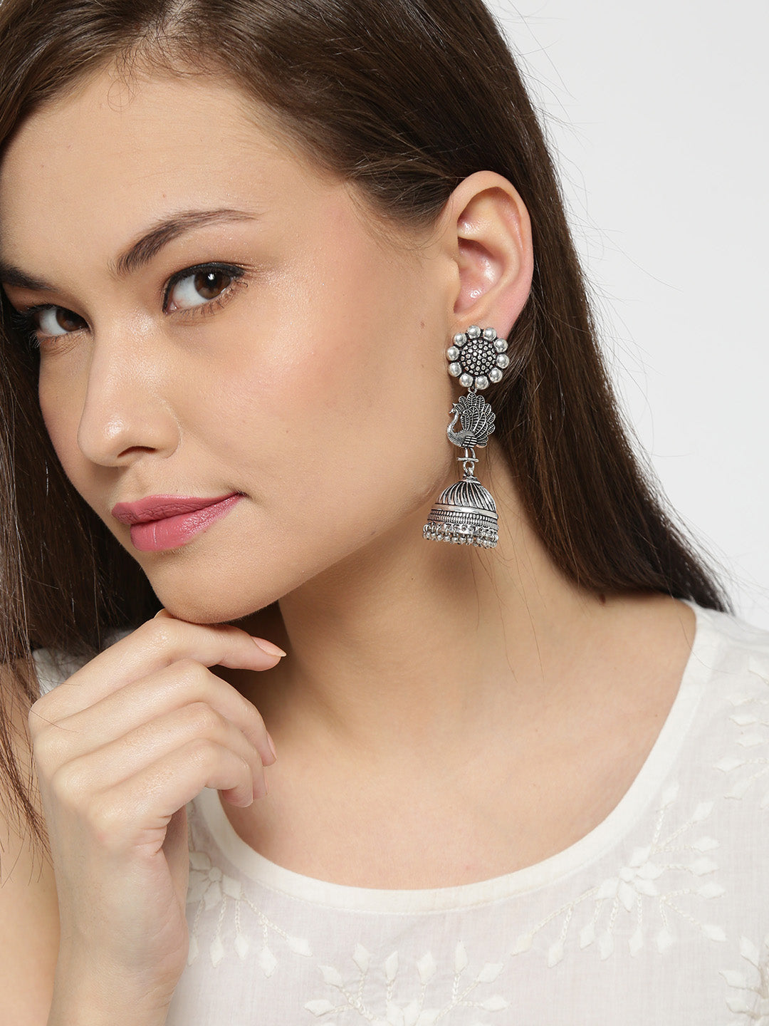Rooted in tradition and rich in detail, these oxidized silver jhumkas bloom with floral domes and engraved kalash-like bases. The cascading beads add rhythmic grace, while the branch-hung display whispers of nature and nostalgia. A timeless adornment for rituals, revelry, and poetic presence
