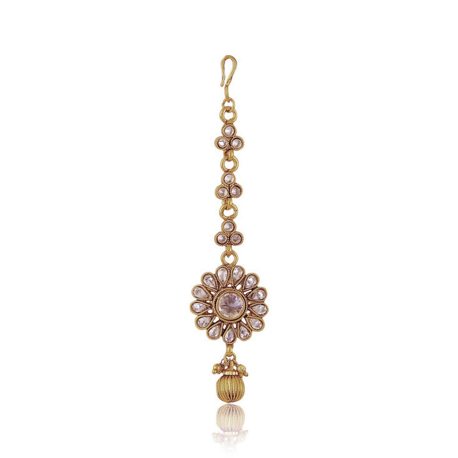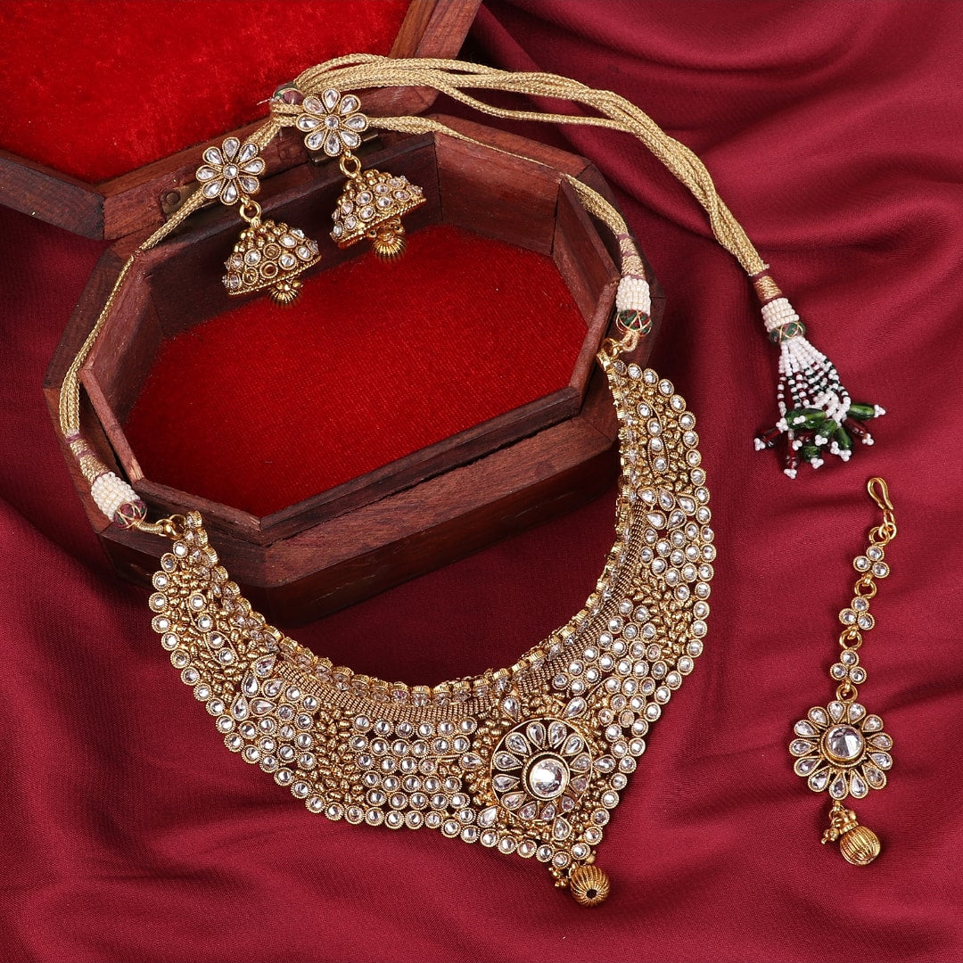 Step into timeless elegance with this exquisite gold-toned kundan jewelry set, crafted to perfection for special occasions. The set includes a beautifully designed choker necklace adorned with shimmering kundan stones, paired with matching floral jhumka earrings and a delicate maang tikka. Intricate detailing, sparkling embellishments, and a regal finish give this set a royal charm that perfectly complements traditional attire. Ideal for weddings, festive celebrations, and cultural events, this jewelry set is a stunning blend of heritage artistry and contemporary sophistication, ensuring you stand out with grace and grandeur.