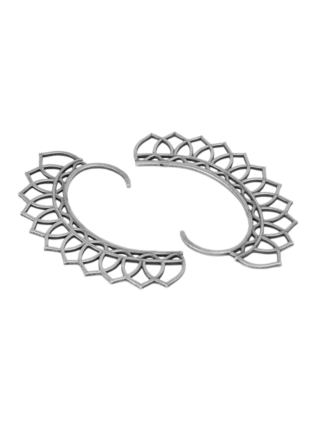 A statement piece of jewelry designed to accentuate your ear with a bold and artistic flair. Crafted in an oxidized silver finish, these cuffs wrap gracefully around the ear, creating the illusion of multiple piercings without the need for extra holes. The intricate detailing reflects traditional craftsmanship while giving a modern, edgy vibe, making them perfect for fusion styling. Lightweight and comfortable to wear, they are ideal for festive occasions, cultural gatherings, or even as a standout accessory with casual outfits. A must-have for those who love experimenting with unique and eye-catching jewelry.