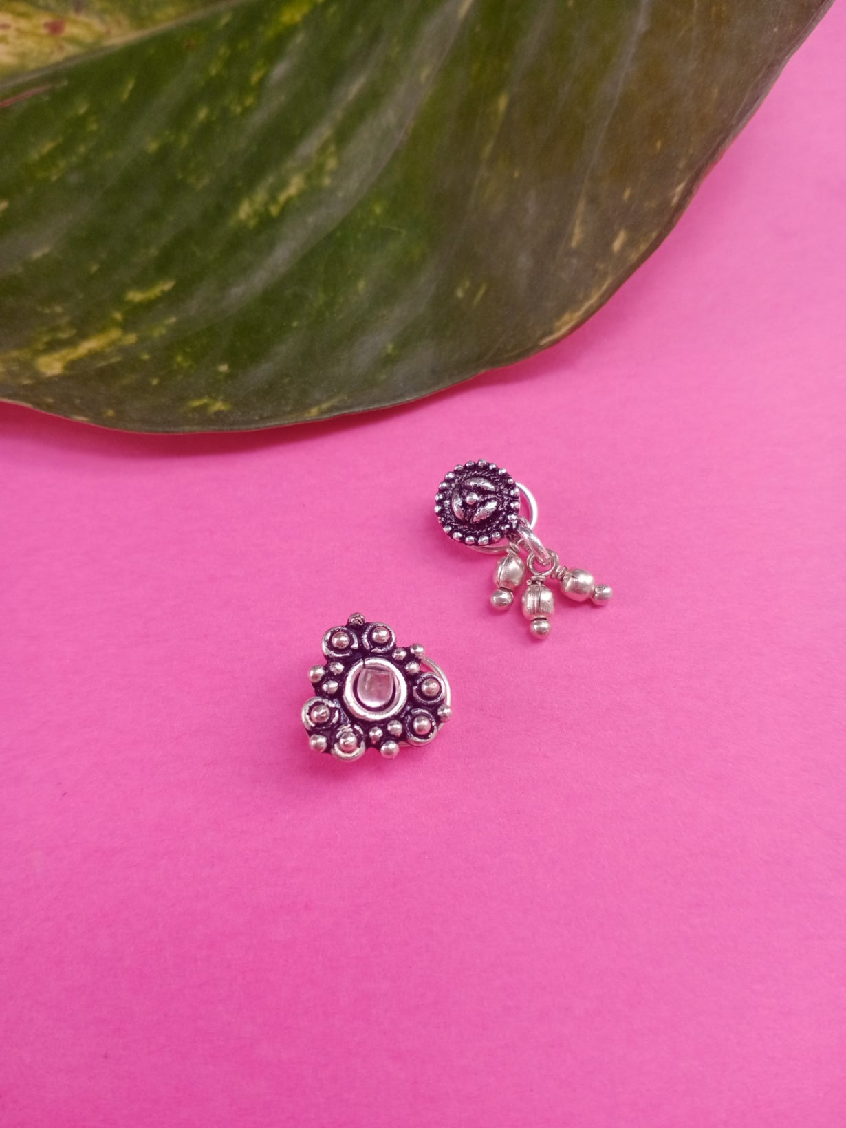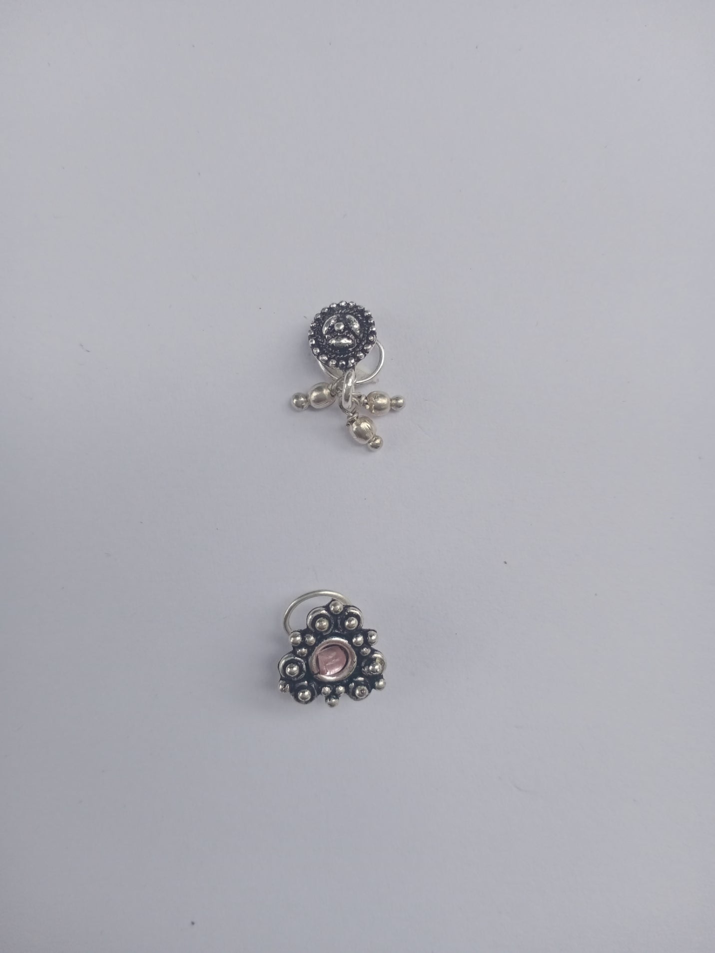 A tale of duality—soft blush and bold shadow. This nosepin duo pairs a light pink shimmer with a raw oxidized finish, echoing the dance of Venus and Saturn, tenderness and strength. Handcrafted to evoke balance and individuality, each piece invites you to wear your moods, your myths, your magic.