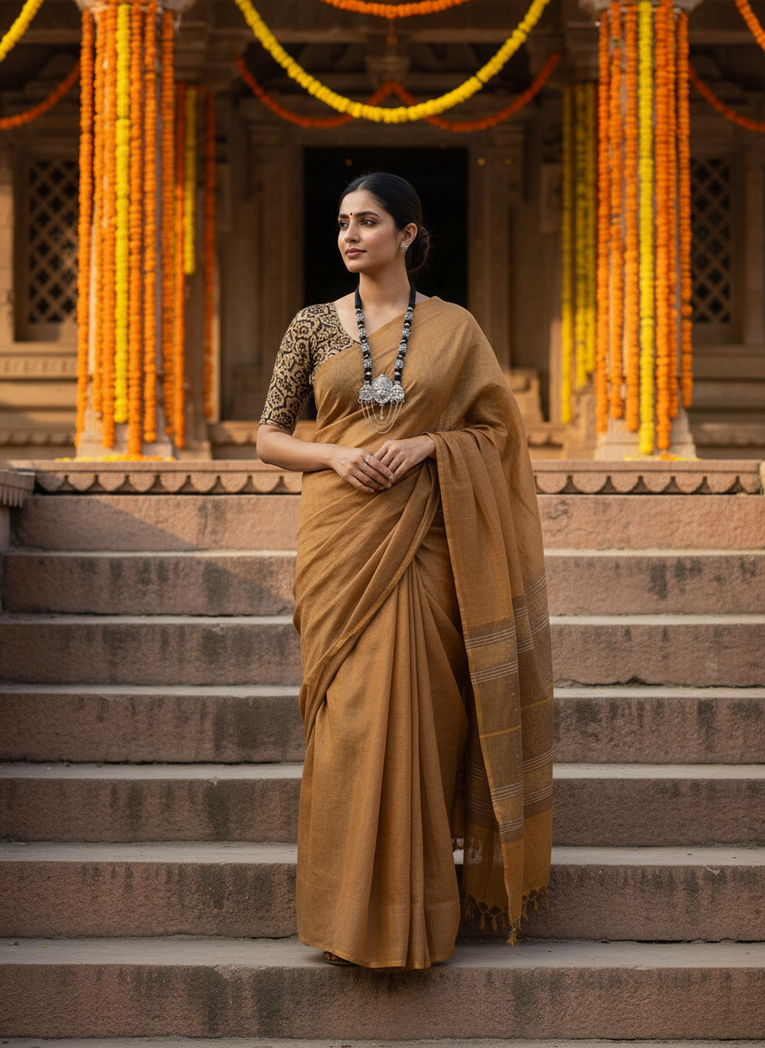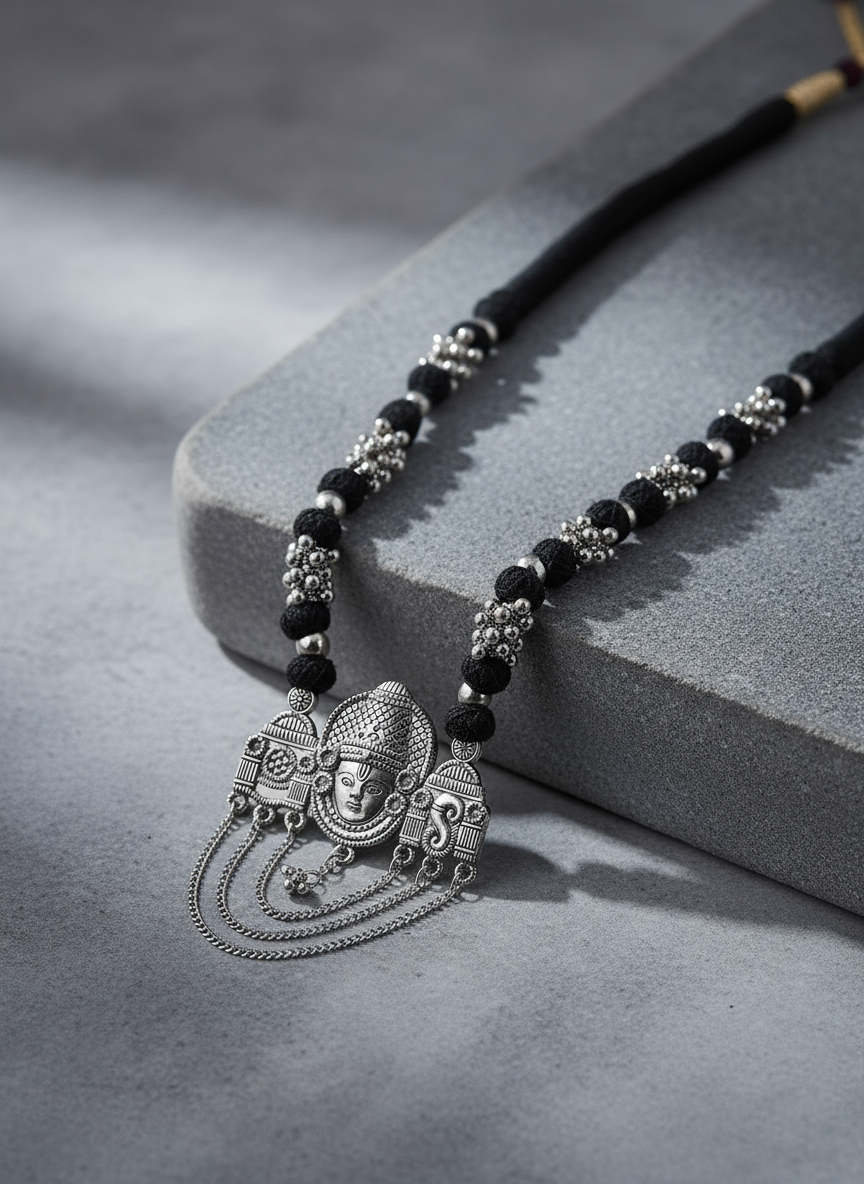 A tribute to timeless artistry, this handcrafted necklace weaves together tradition and allure. Black beads form a rhythmic chain, leading to a majestic oxidized silver pendant—etched with ancestral motifs and adorned with three cascading chains that echo temple bells. Rooted in heritage yet bold in presence, Triveni evokes the sacred confluence of craft, culture, and spirit.