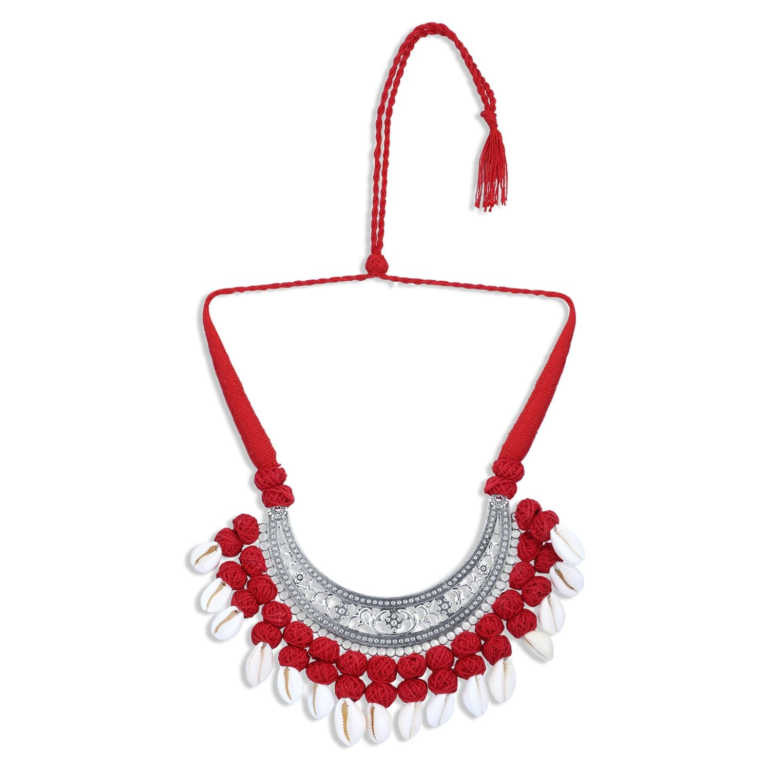 Bold and vibrant, this tribal choker necklace features a striking oxidized silver centerpiece paired with layers of red thread beads and cowrie shells. A perfect fusion of earthy charm and ethnic elegance, it adds a statement touch to both traditional and contemporary outfits.