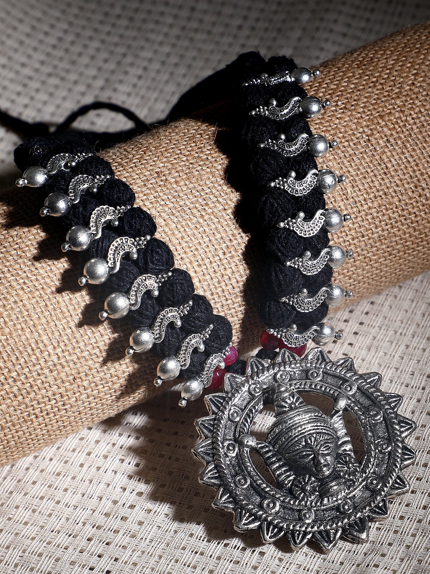 This bold tribal choker necklace features a striking oxidized silver-toned pendant depicting a traditional deity face, framed with an ornate sunburst design. The black woven fabric base is adorned with silver-toned paisley motifs, tiny ghungroo accents, and hints of red bead detailing, adding depth and contrast to the piece. Perfect for making a statement, this handcrafted necklace blends cultural artistry with contemporary edge, ideal for festive occasions, cultural gatherings, or adding a boho-ethnic flair to modern outfits.