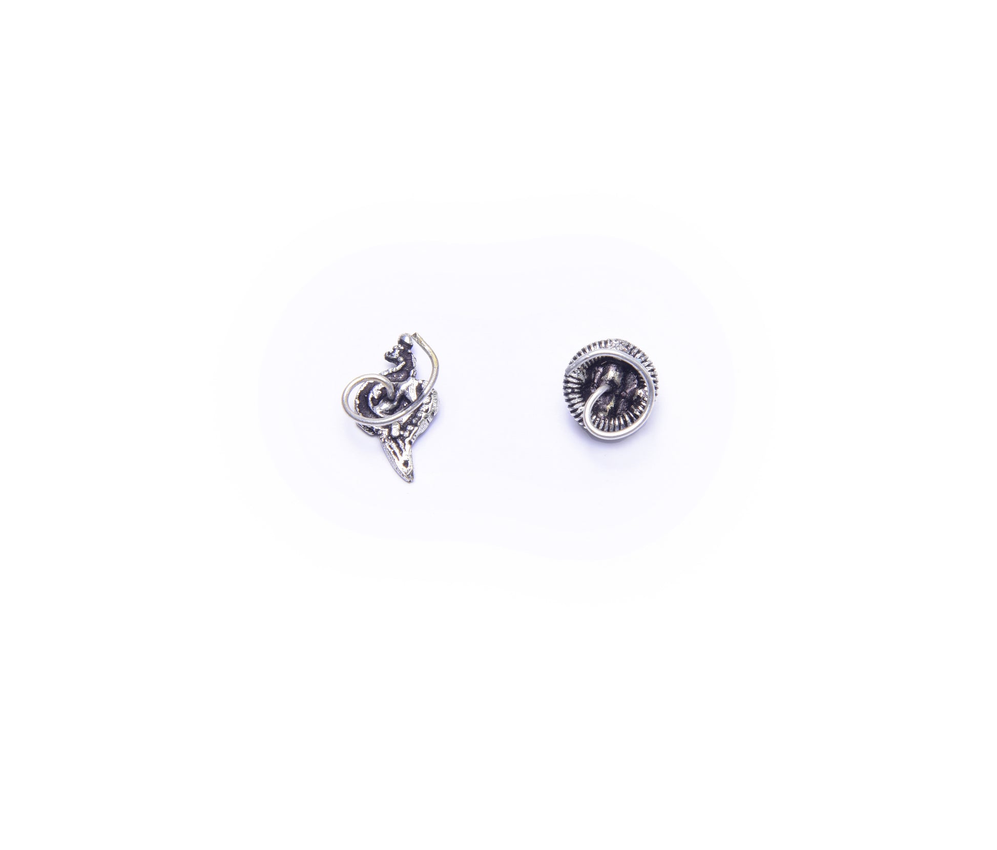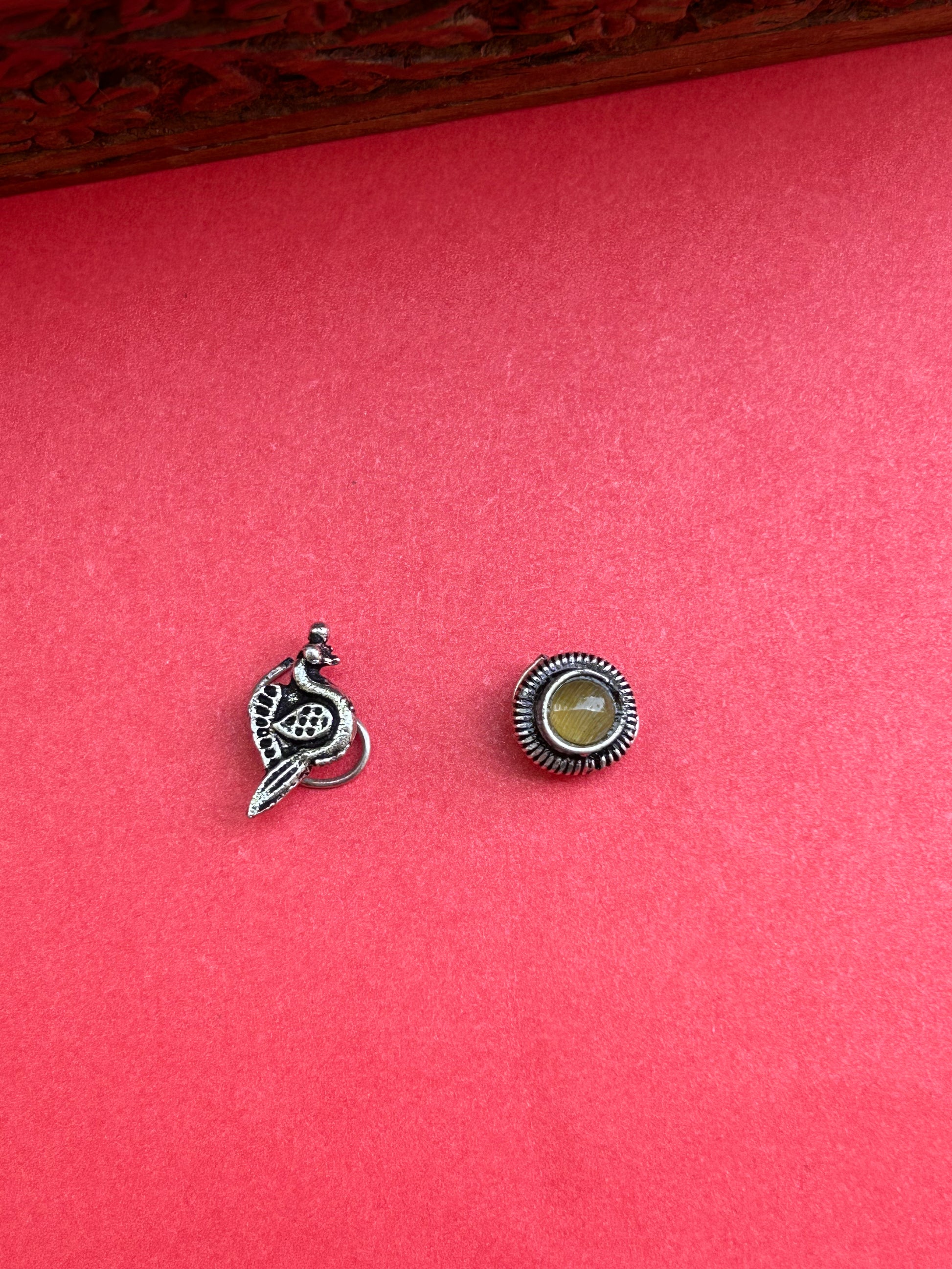 This elegant combo set brings together two beautifully handcrafted oxidized nosepins, perfect for pierced noses. One design features a graceful peacock motif, symbolizing beauty and tradition, while the other showcases a round stone-studded nosepin with intricate detailing that adds a timeless charm.